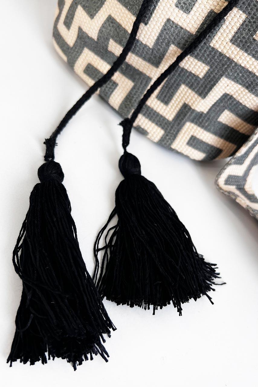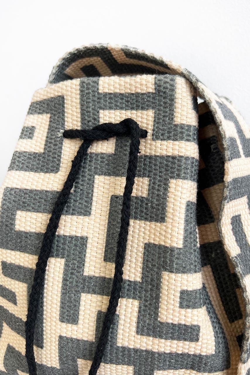 Glam rock καλοκαιρινό πουγκί σε ασπρόμαυρη απόχρωση με γεωμετρικά σχέδια στο μοτίβο και κορδόνι αυξομείωσης με φουντίτσα στο τελείωμα.