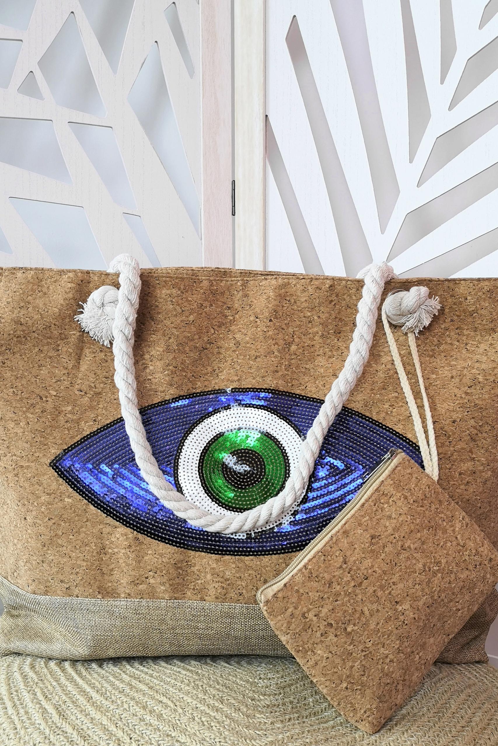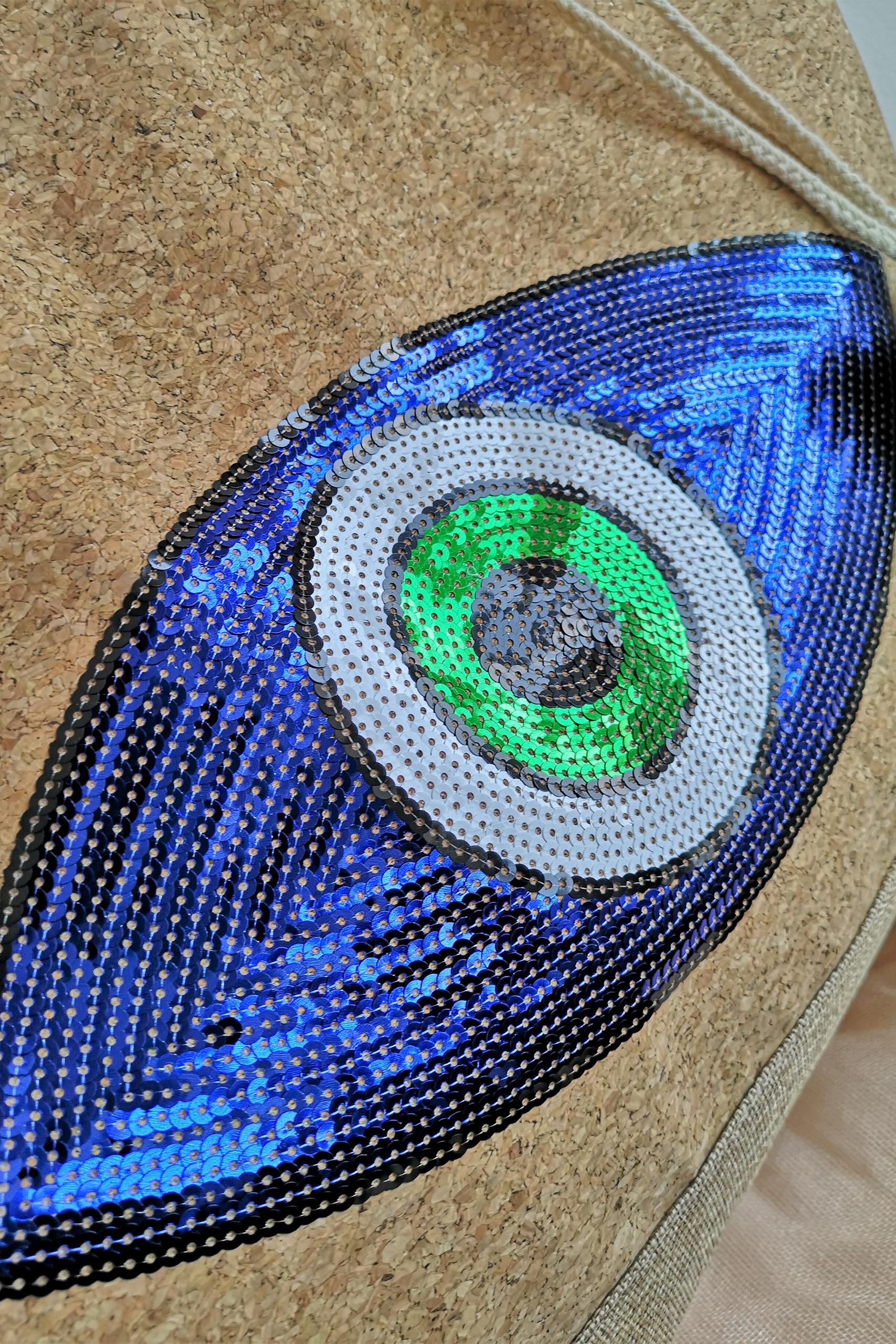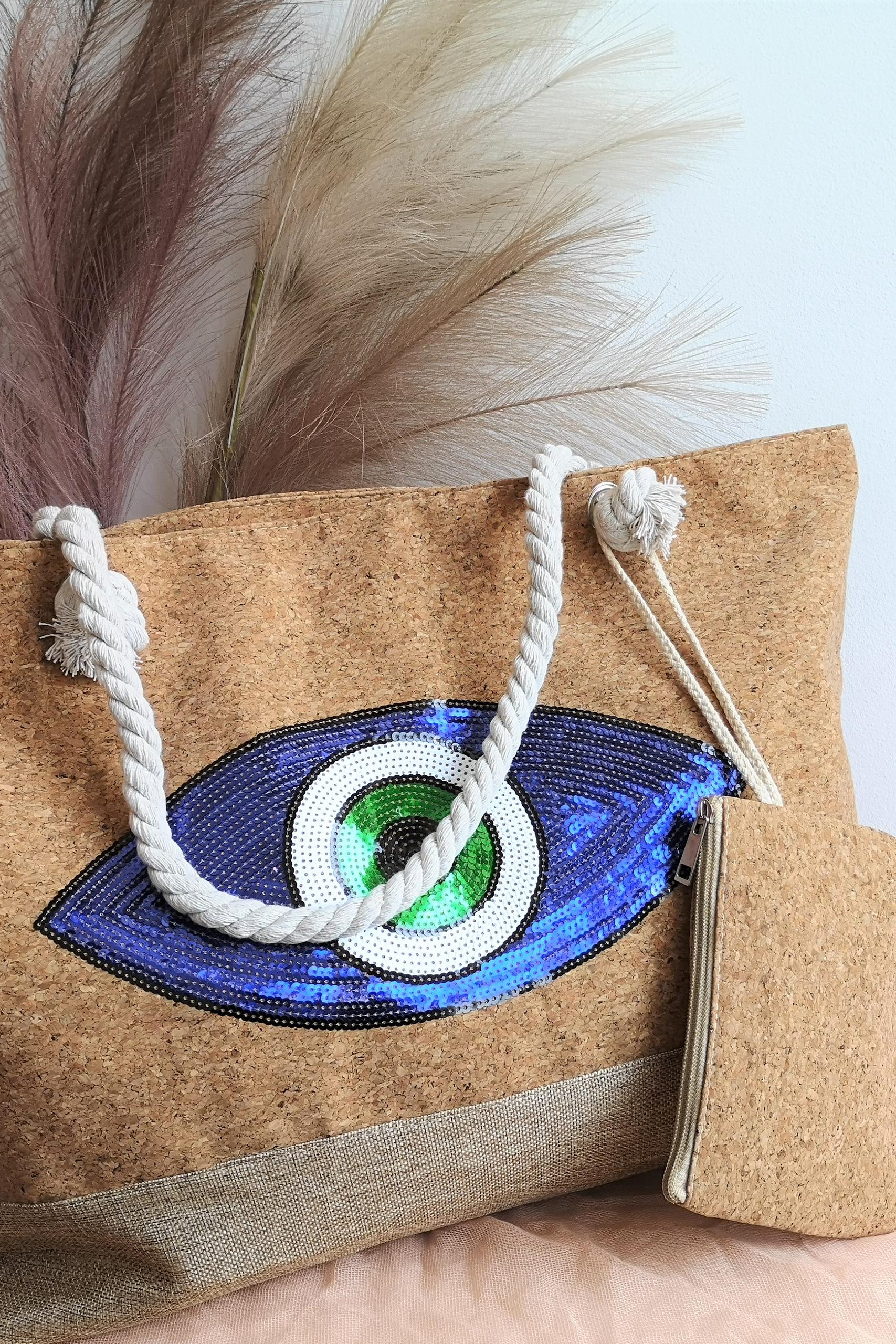 Tote bag από φελλό με patch μπλε μάτι από παγιέτες και μικρό εσωτερικό τσαντάκι από φελλό.
