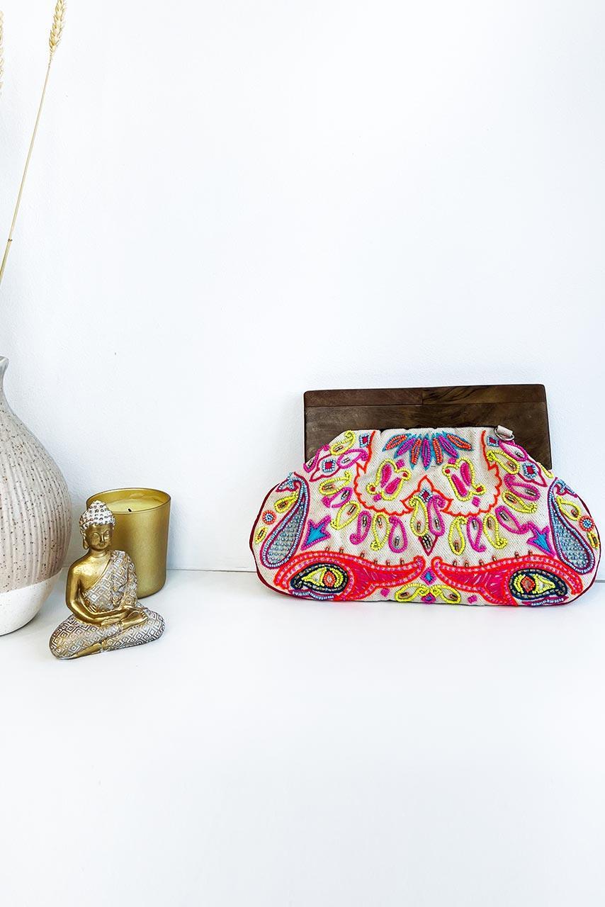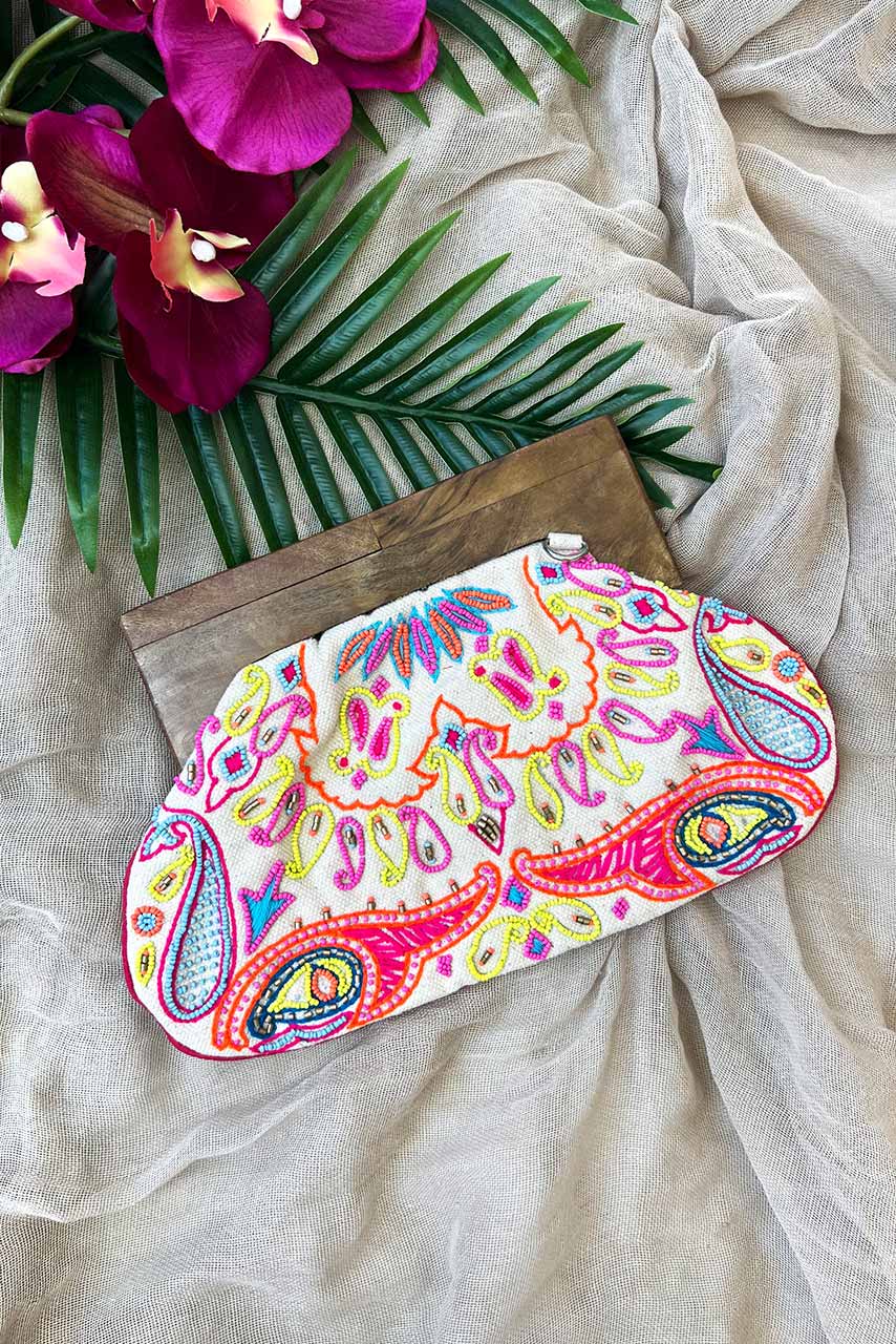 Boho vintage τσαντάκι clutch με κεντημένα λαχούρια από πολύχρωμες χάντρες σε λευκή απόχρωση και vintage λεπτομέρεια φαρδύ ξύλινο κούμπωμα.
