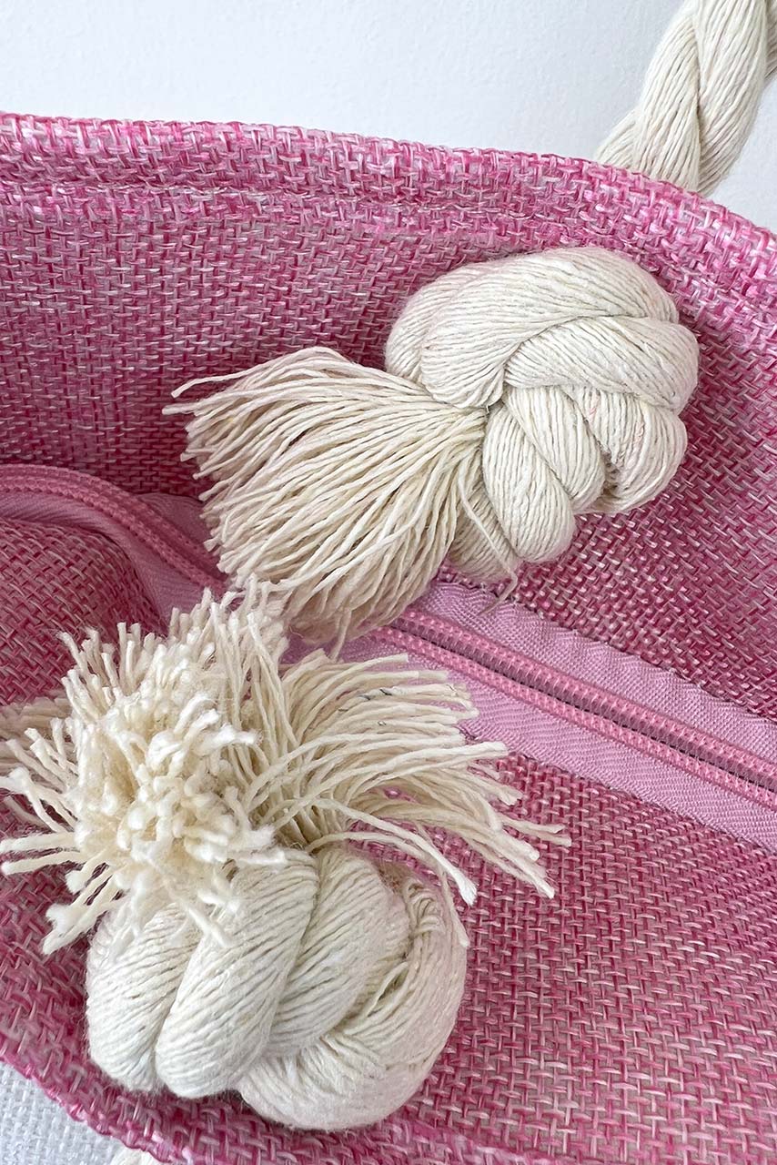 Τσάντα tote bag summer time από βαμβακερό υλικό με μονόχρωμο tencel pattern σε ροζ χρώμα και χειρολαβές από σκοινί, φερμουάρ και εσωτερική θήκη.