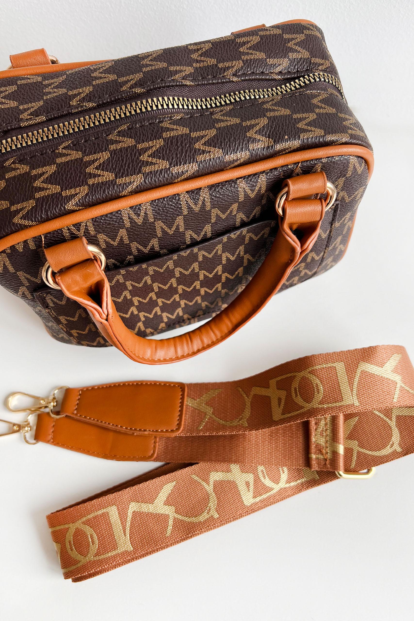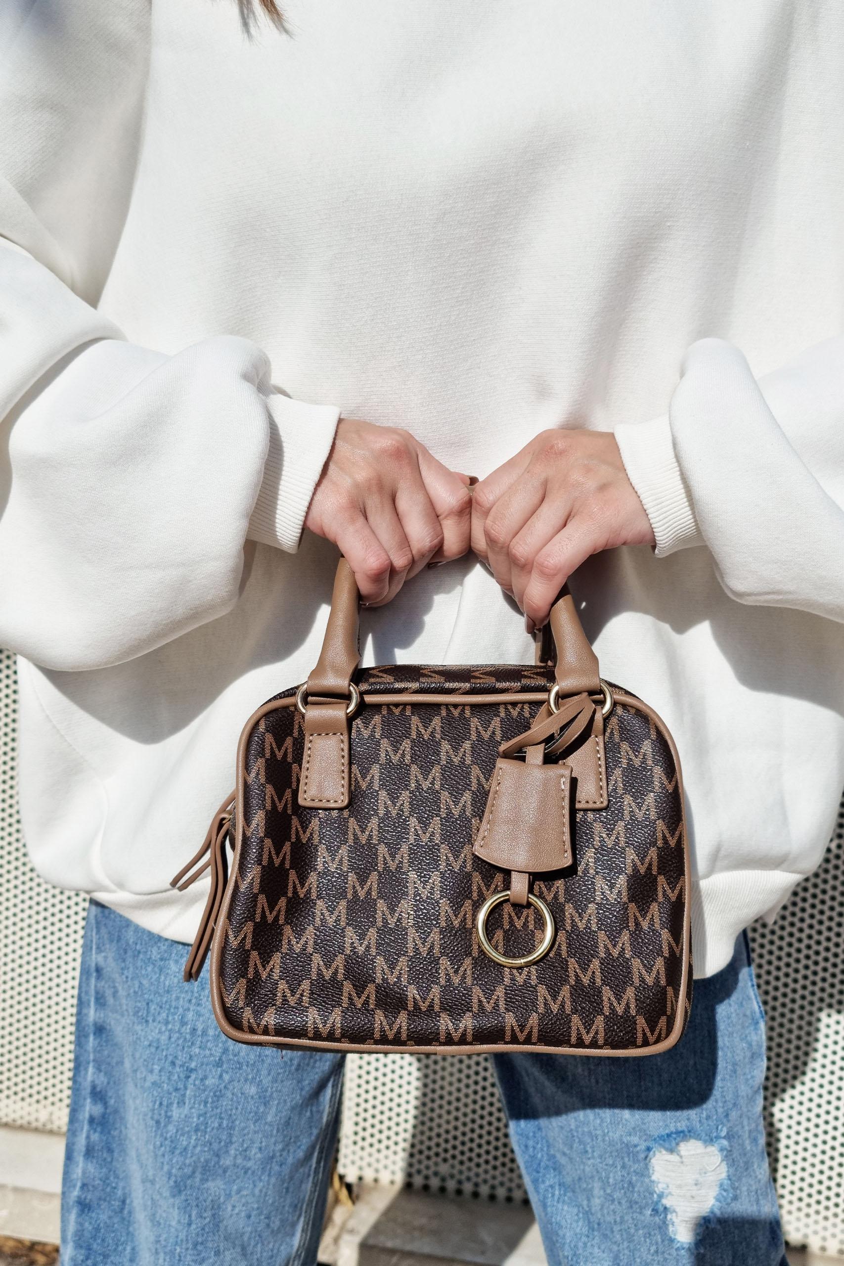 Τετράγωνη εμπριμέ τσάντα με λεπτομέρεια μπρελόκ κρίκο στο έξω μέρος και έντονα φερμουάρ.