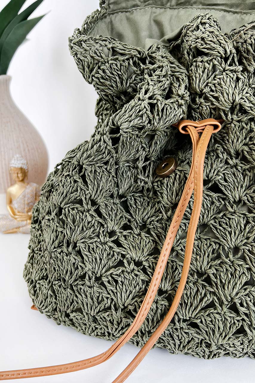 Hippie summer backpack τσάντα πλάτης με ψάθινες λεπτομέρειες στις γήινες αποχρώσεις του χακί, του καφέ και του μπεζ της άμμου.