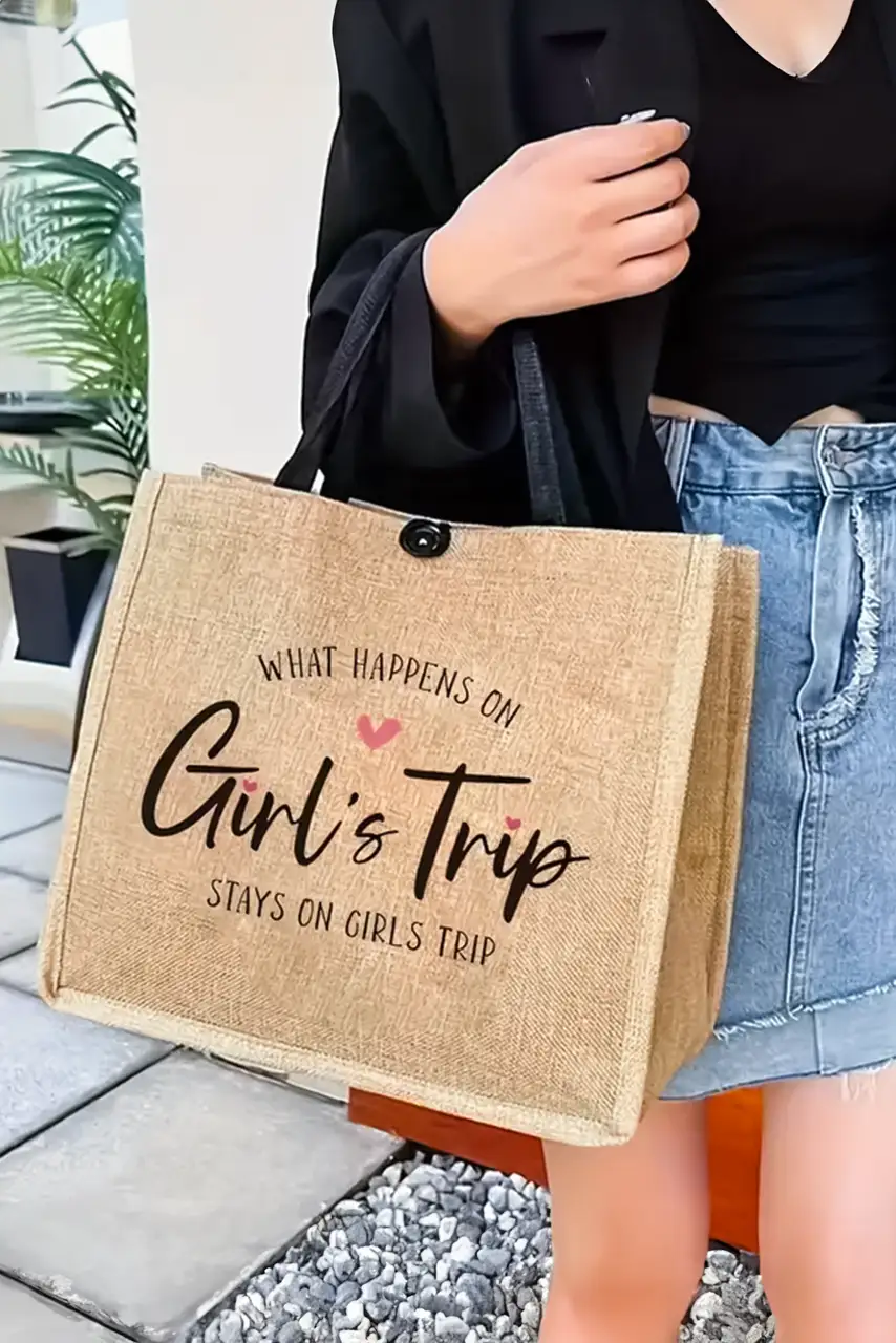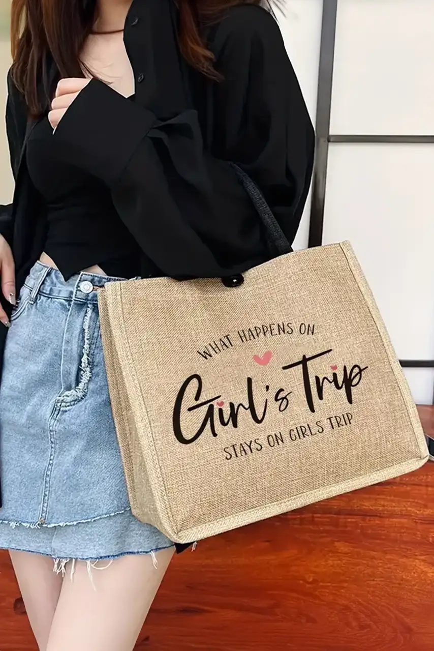 Ready for your next girl’s trip; Αυτή η oversized τσάντα με το απόλυτο quote “What happens on Girl’s Trip, stays on Girl’s Trip” είναι ο ορισμός του fun & functional! Το ανθεκτικό της ύφασμα τύπου λινάτσας προσφέρει στιβαρότητα, ενώ οι δερματίνη λεπτομέρειες στα χερούλια προσθέτουν chic αντίθεση.
