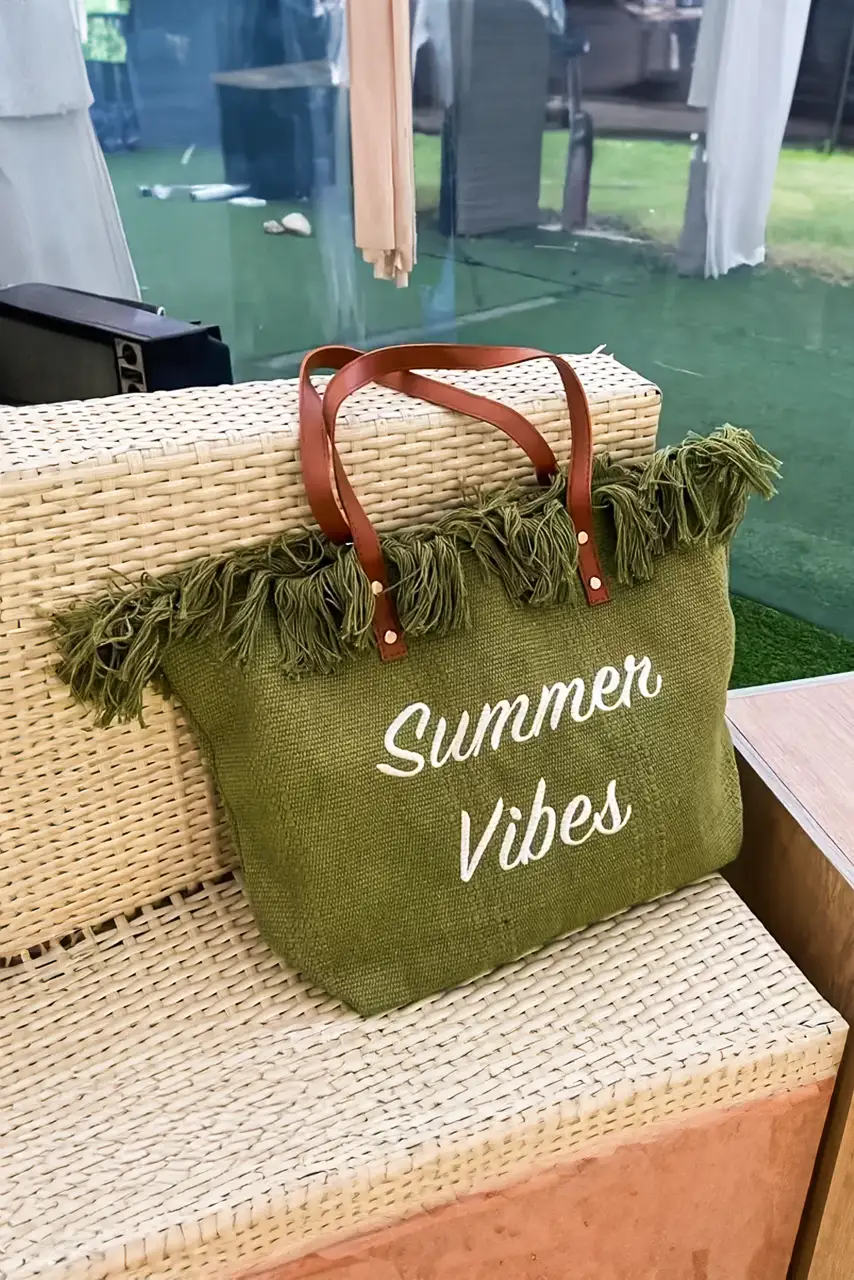 Το απόλυτο beach essential για φέτος το καλοκαίρι! Η τσάντα “Summer Vibes” σε χακί απόχρωση με μπλε slogan είναι ο τέλειος συνδυασμός στυλ και άνεσης. Κατασκευασμένη από ανθεκτικό ψάθινο ύφασμα και διακοσμημένη με δερμάτινα χερούλια, προσφέρει χωρητικότητα για όλα τα απαραίτητα της παραλίας – από αντηλιακά μέχρι το αγαπημένο σου βιβλίο.