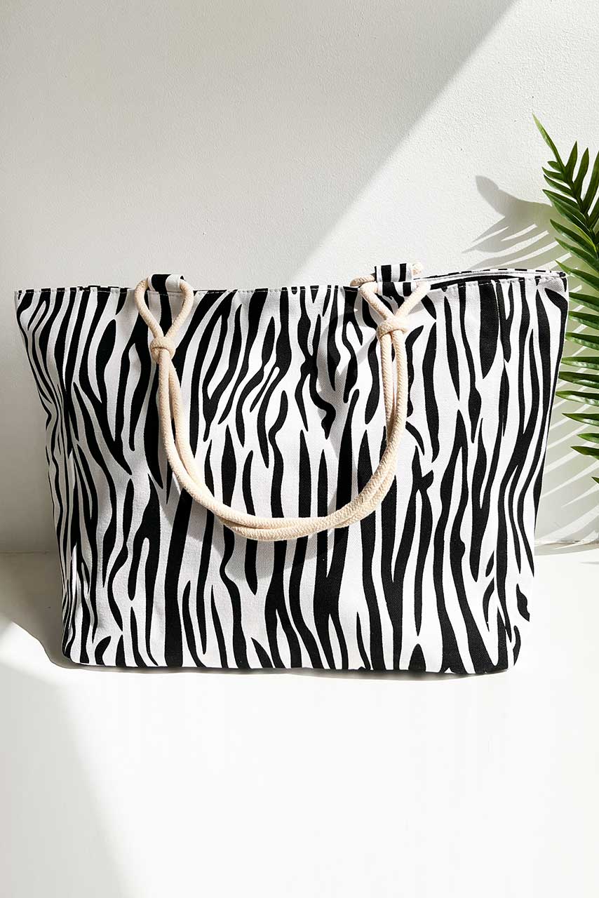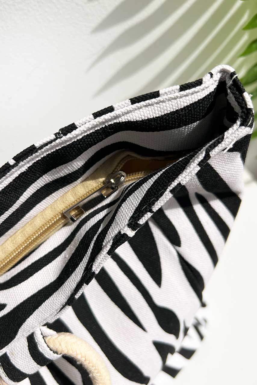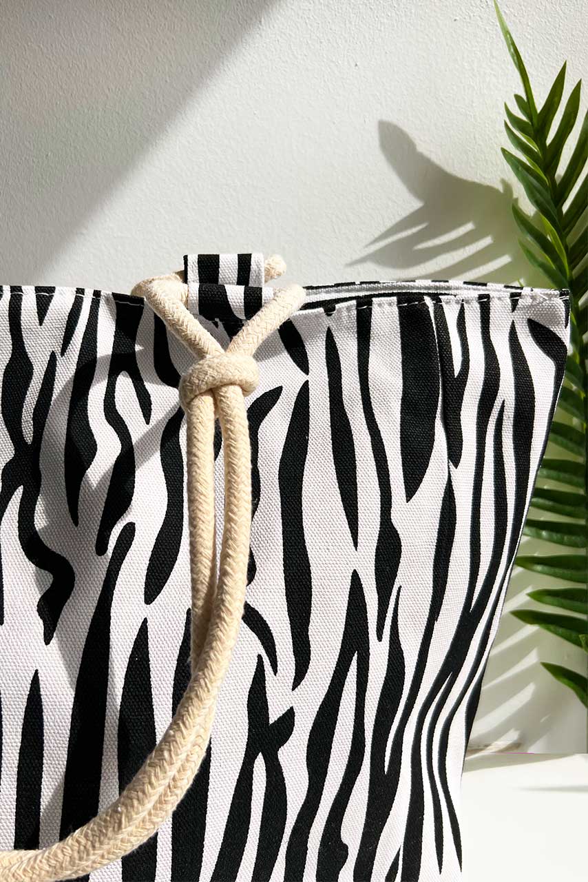 Zebra tote ασπρόμαυρη bag τσάντα παραλίας σε animal print zebra μοτίβο με χερούλια από σκοινί.