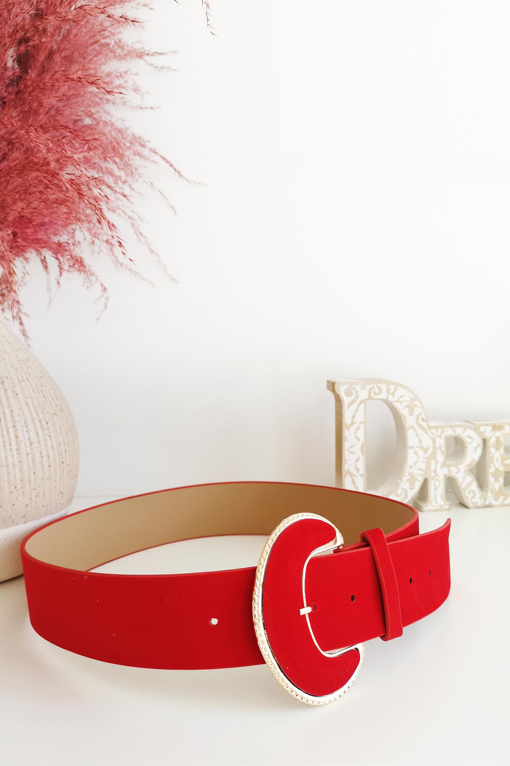 Ζώνη με αγκράφα σε έντονο κόκκινο και καφέ με χρυσή λεπτομέρεια.