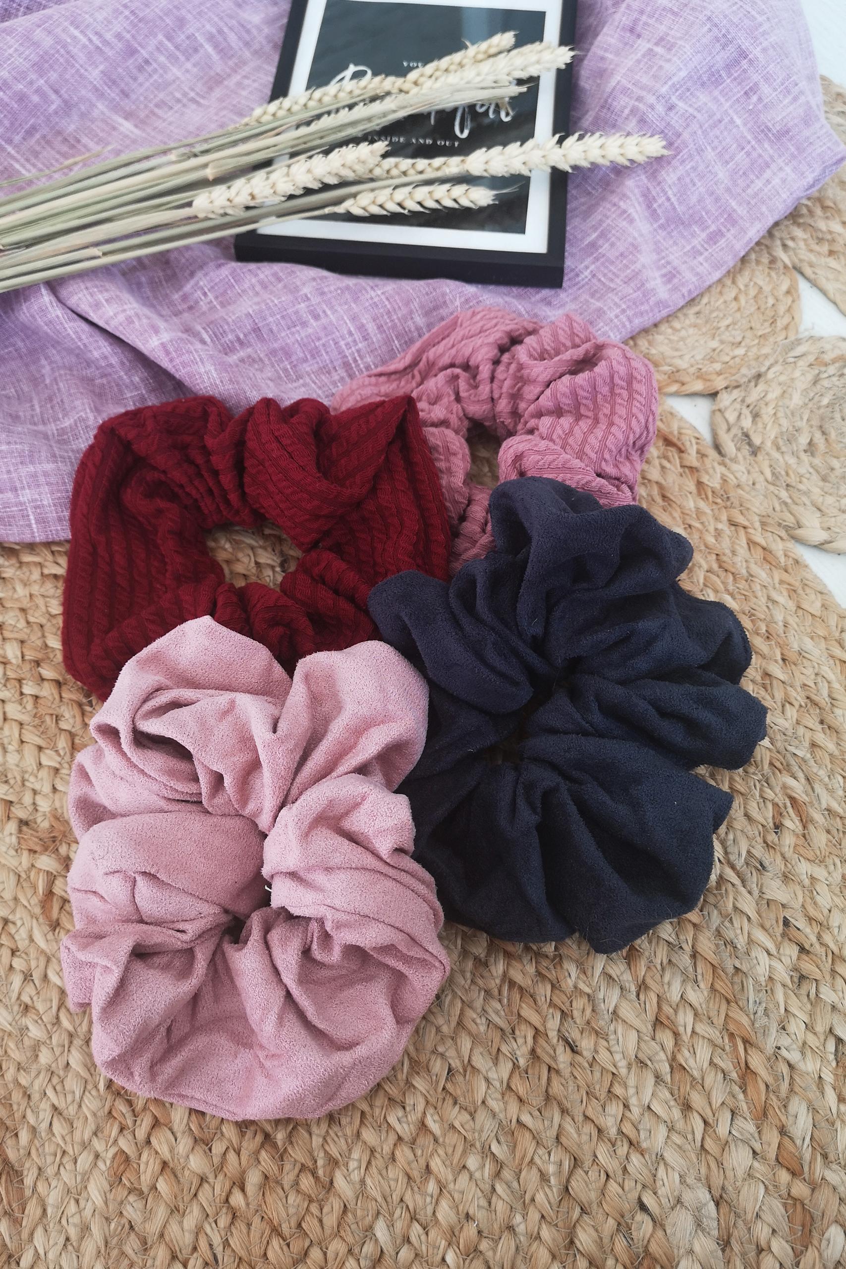 Boho girly scrunchies σε suede και knitted υφές και ζεστές φθινοπωρινές αποχρώσεις.