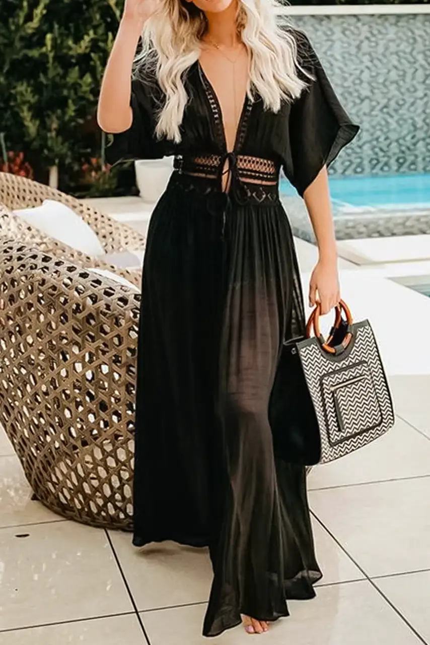 Το απόλυτο καλοκαιρινό item που απογειώνει τις εμφανίσεις σου δίπλα στην πισίνα ή την παραλία! Το μαύρο διάφανο beachwear με διακριτικές δαντελένιες λεπτομέρειες στη μέση και στο τελείωμα του ντεκολτέ, προσφέρει έναν αισθησιακό αλλά και elegant χαρακτήρα. Η αέρινη υφή του και το ανάλαφρο κόψιμο με ανοίγματα, προσδίδουν δυναμισμό και θηλυκότητα στο look σου.