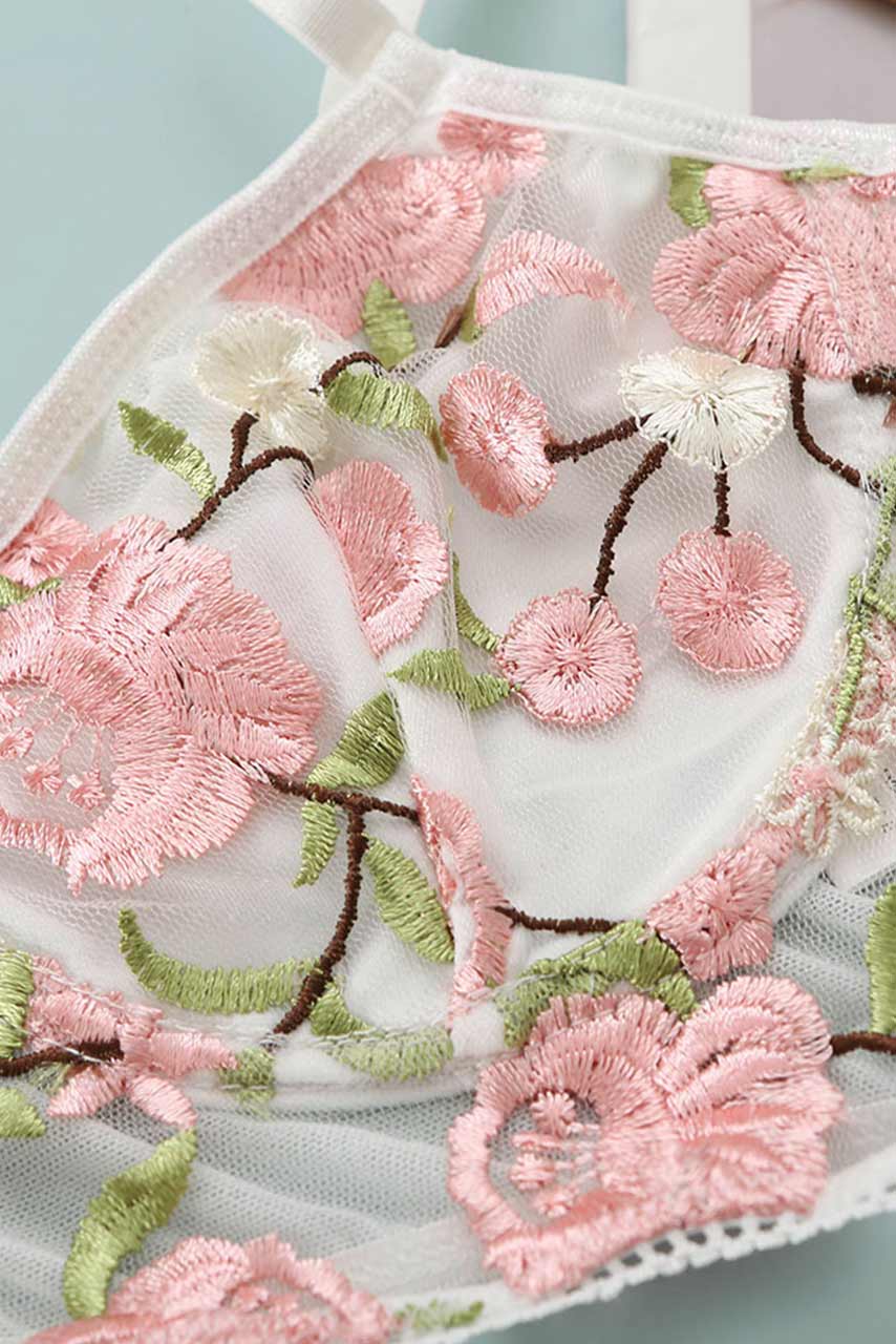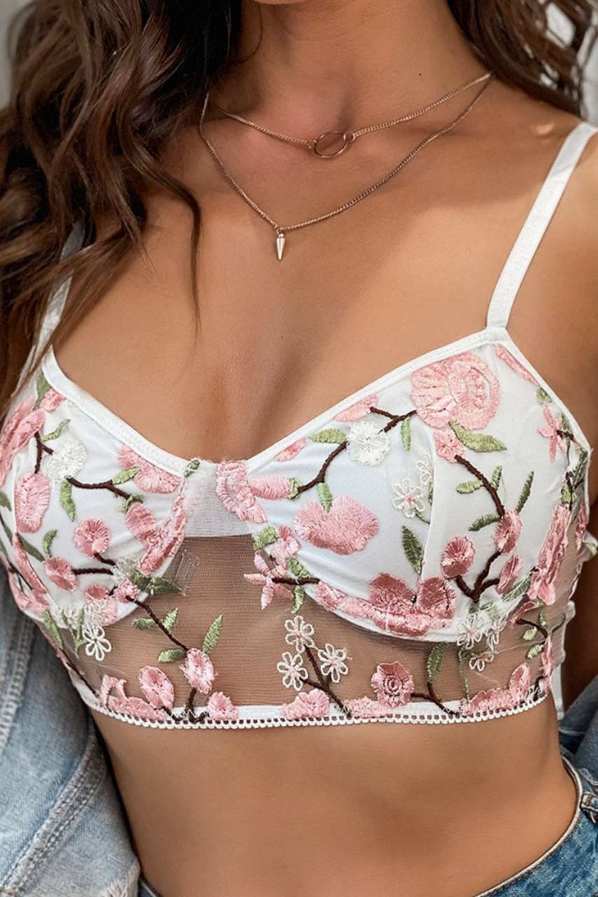 Λευκό ημιδιάφανο μπουστάκι με ασύμμετρο floral κεντητό. Οι τιράντες είναι ρυθμιζόμενες για να προσαρμόζονται εύκολα σε κάθε σωματότυπο,