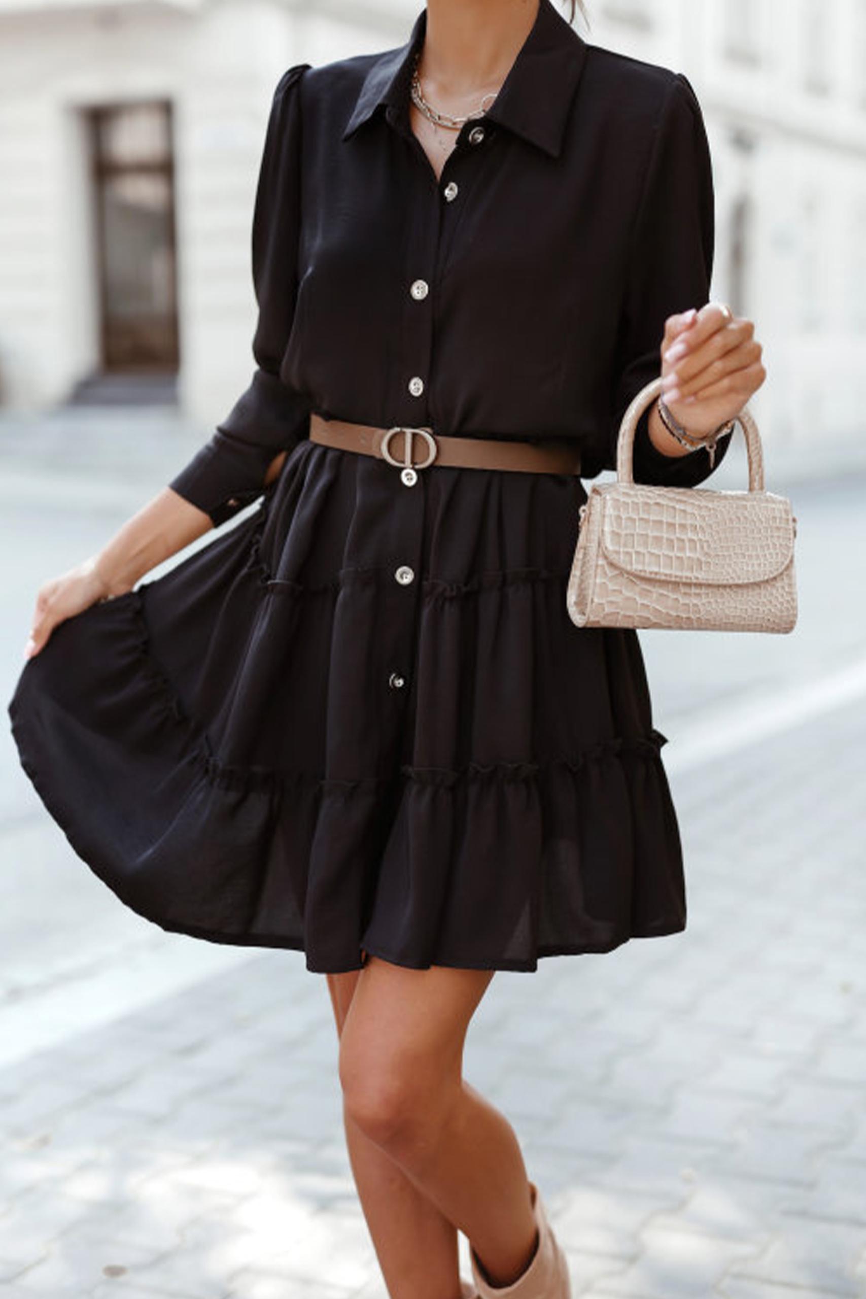 A line mini dress μαύρο με κουμπιά κατά μήκος και φούστα με βολάν στο κάτω μέρος.