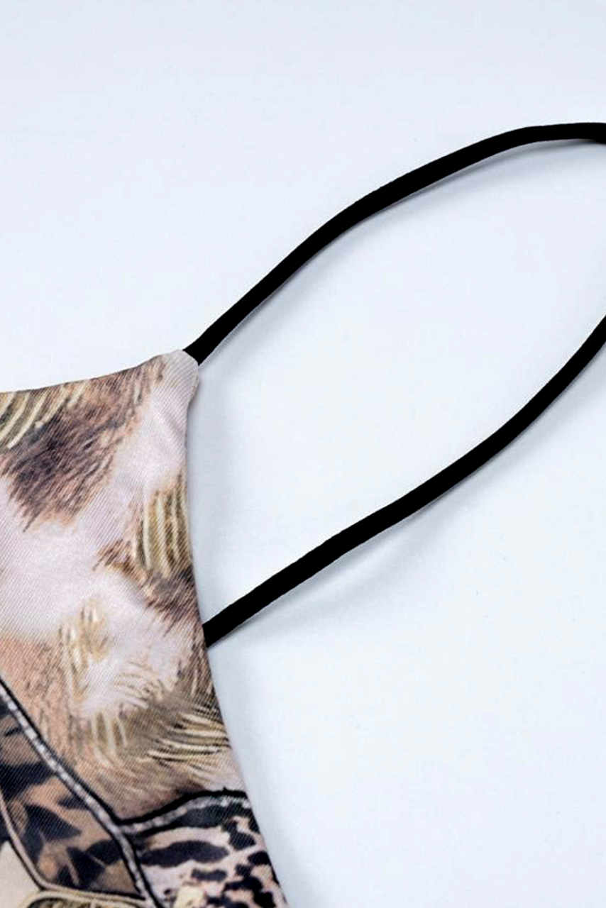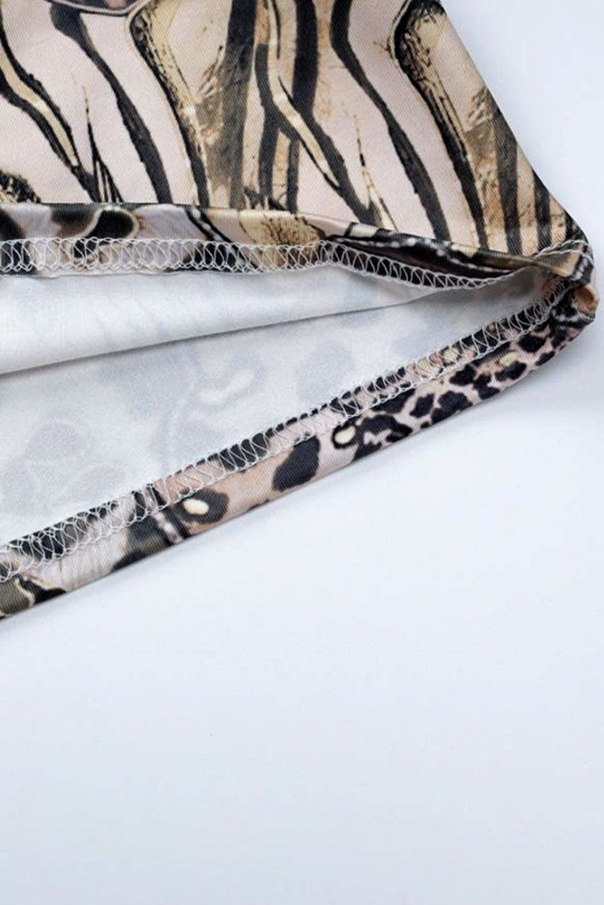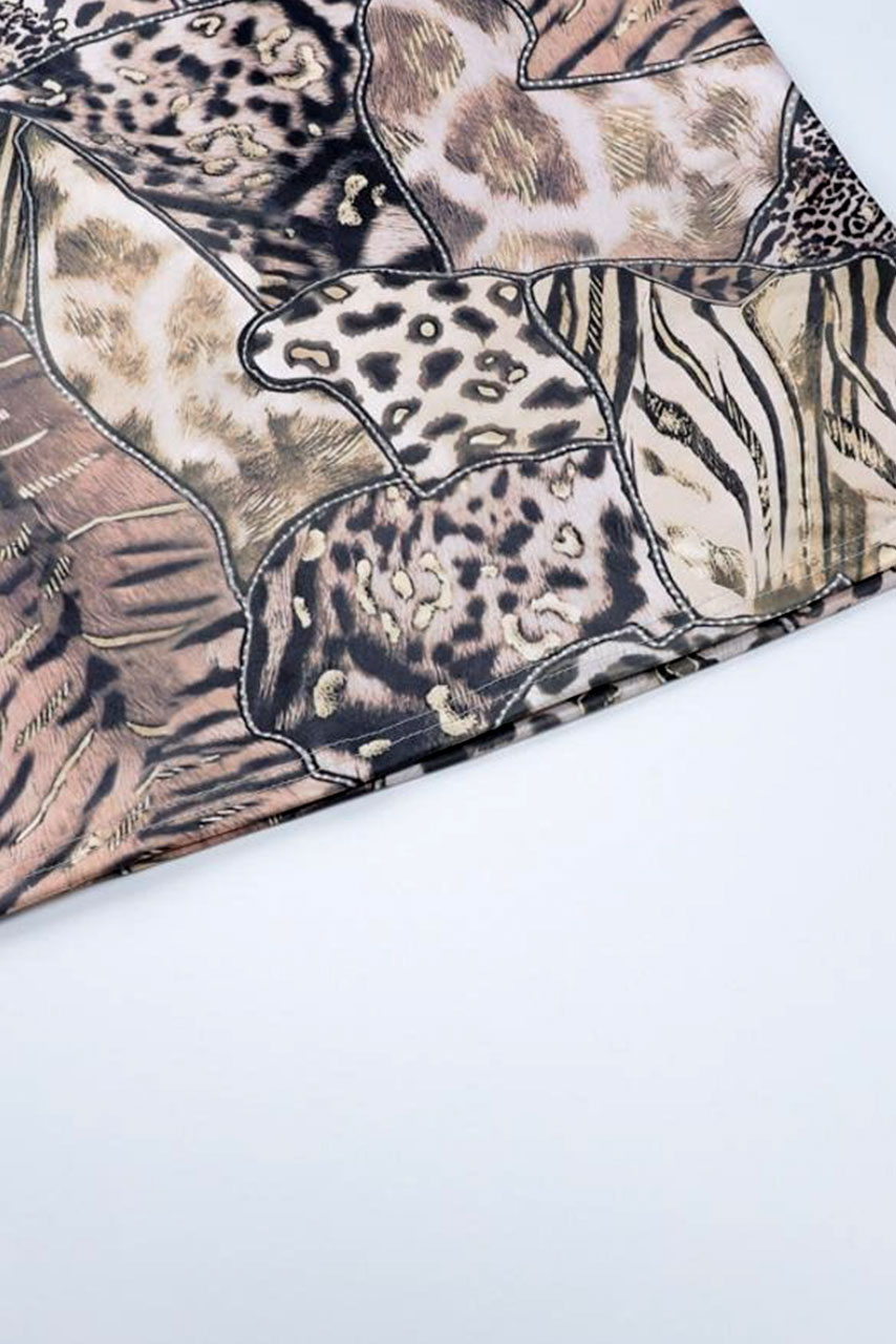 Ελαστικό bodycon μίνι φόρεμα με διάφορα λεοπάρ και τίγρη μοτίβων. Το φόρεμα έχει λεπτές τιράντες σπαγγέτι και ντεκολτέ sweetheart. Είναι pencil, κολακεύει πολύ την σιλουέτα σου και ιδανικό για βραδινές η κοκτέιλ περιστάσεις.