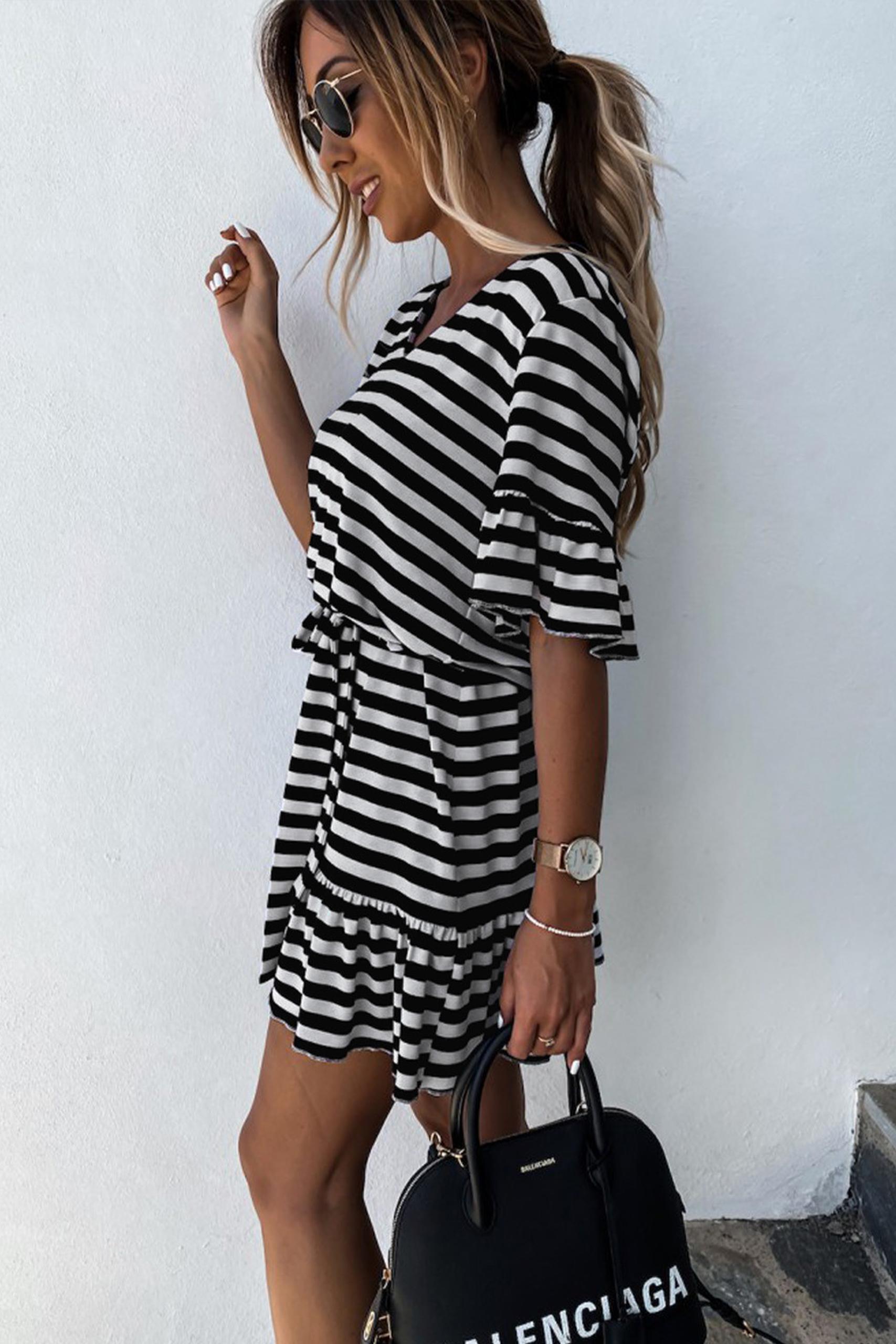 Μίνι ασπρόμαυρο ριγέ φόρεμα με βολάν στο τελείωμα.