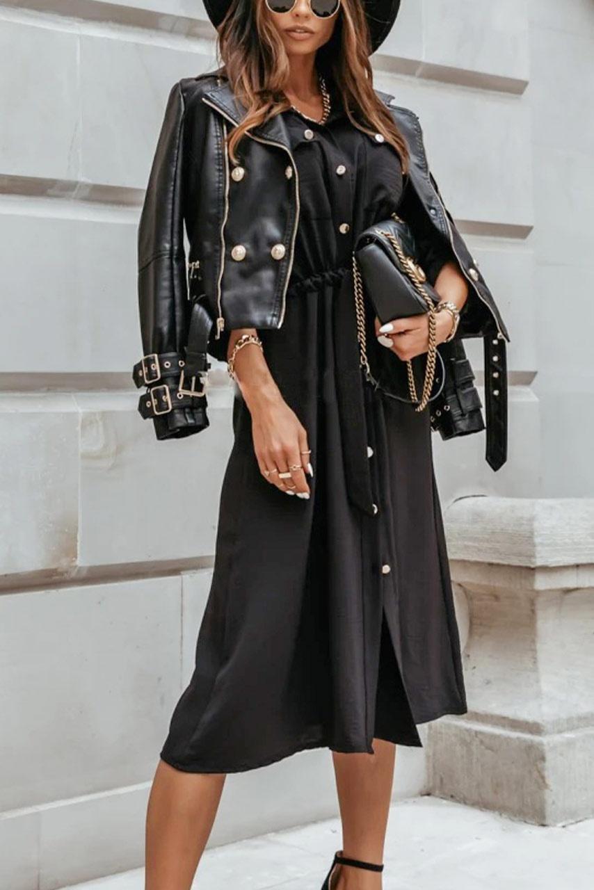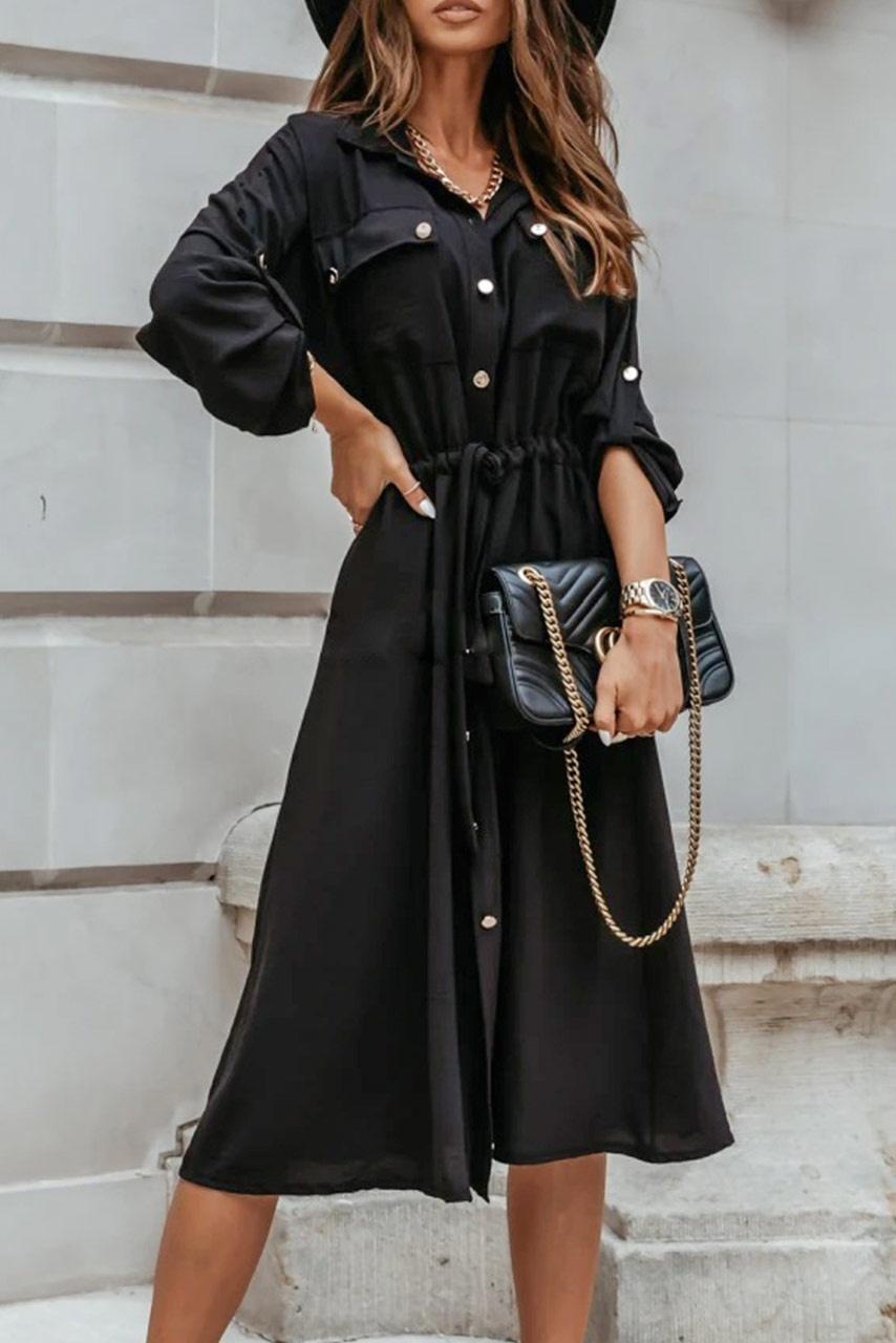 All day φόρεμα σε A line με κουμπιά κατά μήκος και μεγάλες τσέπες, σε μαύρη απόχρωση.
