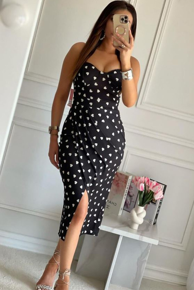 Μαύρο vintage εφαρμοστό φόρεμα με λευκές καρδιές