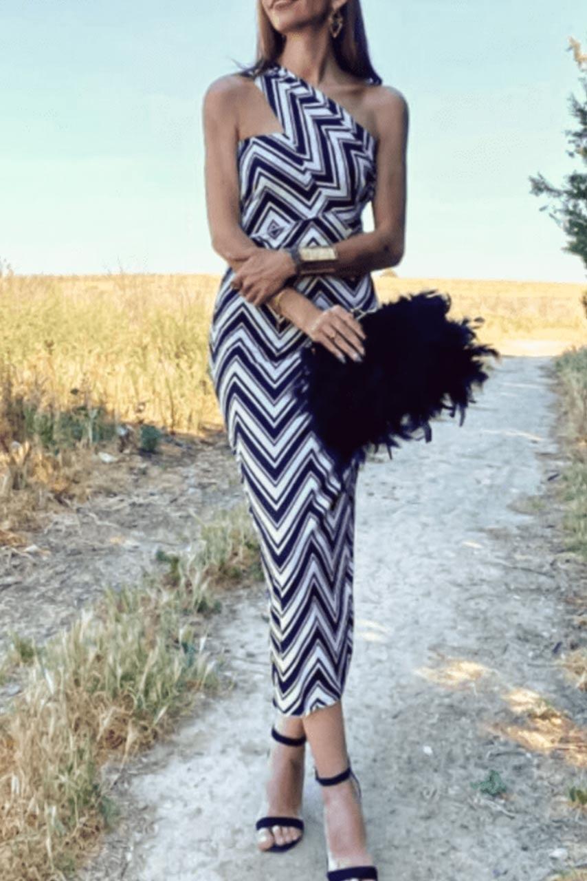Φόρεμα μακρύ με μια τιράντα και zigzag print. Ένα μοναδικό κομμάτι που θα τραβήξει τα βλέμματα και θα αγαπήσεις.