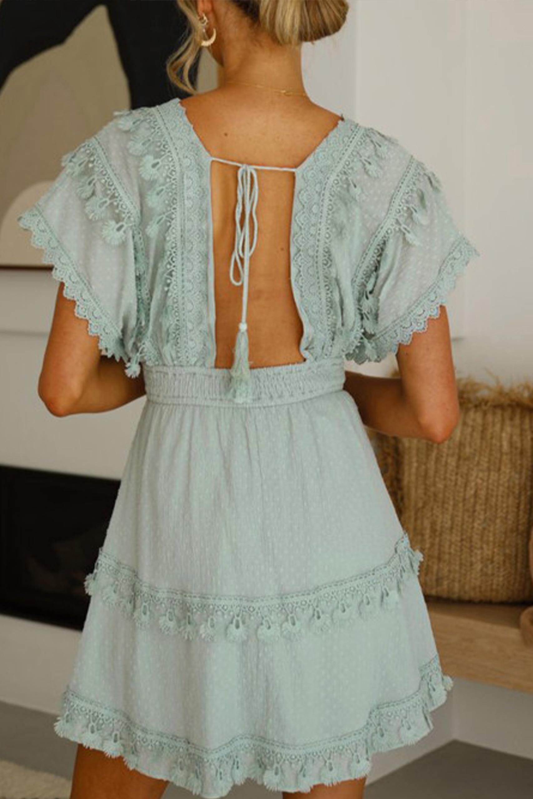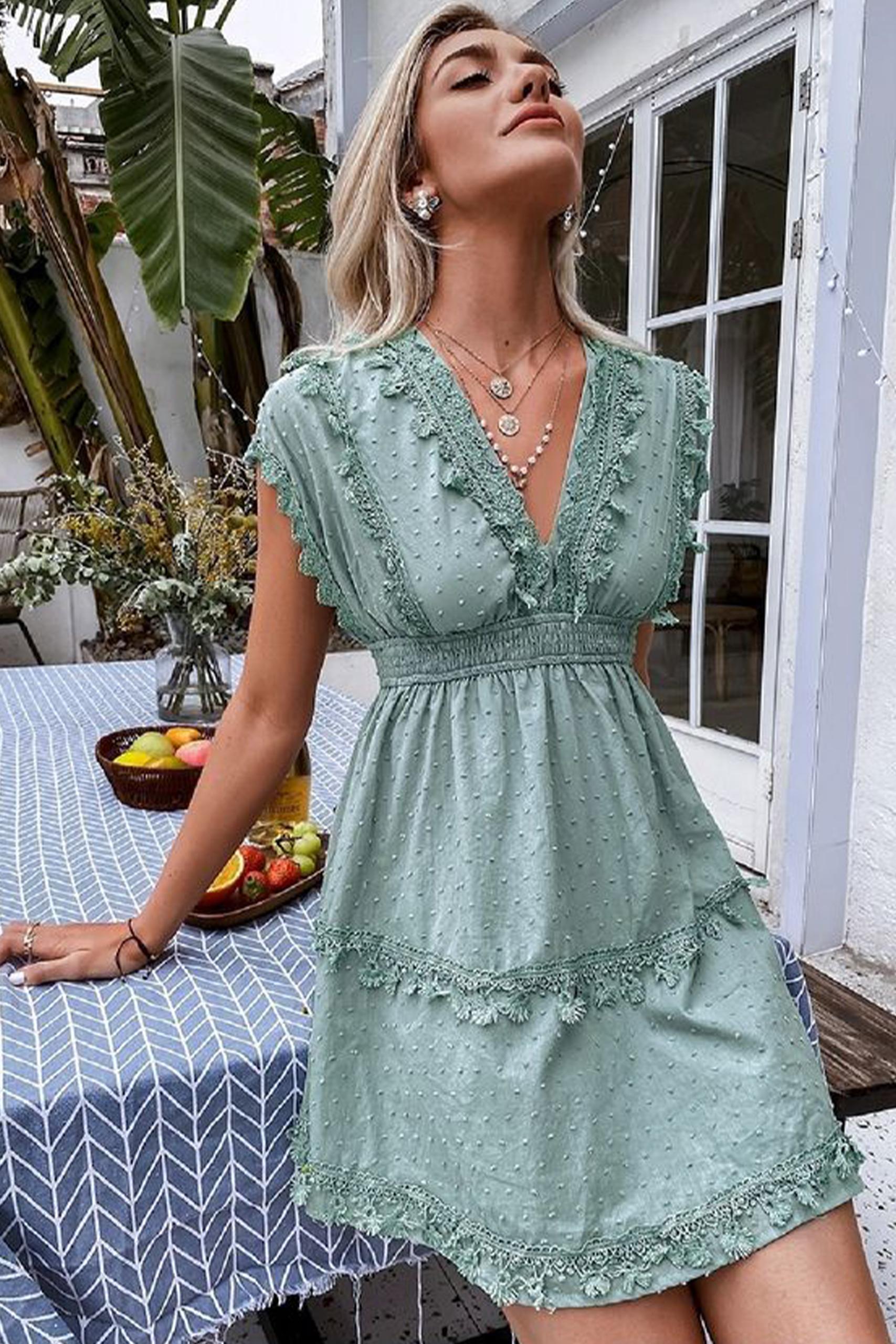 Φυστικί boho φόρεμα σε Α γραμμή με λεπτομέρειες δαντέλας και διαφάνειας.