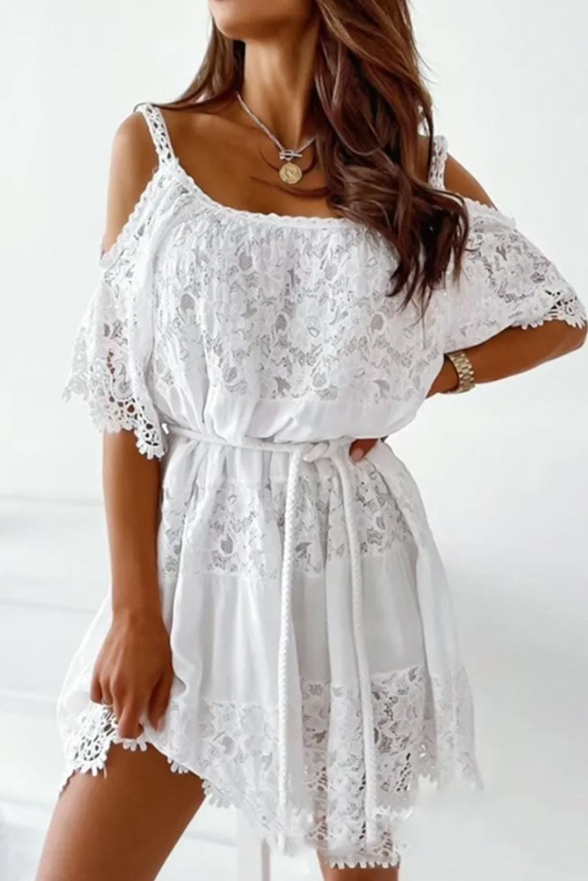 Ρομαντικό μίνι φόρεμα με δαντέλα έξωμο σε λευκή απόχρωση. Διατίθεται σε onesize και καλύπτει έως large size.