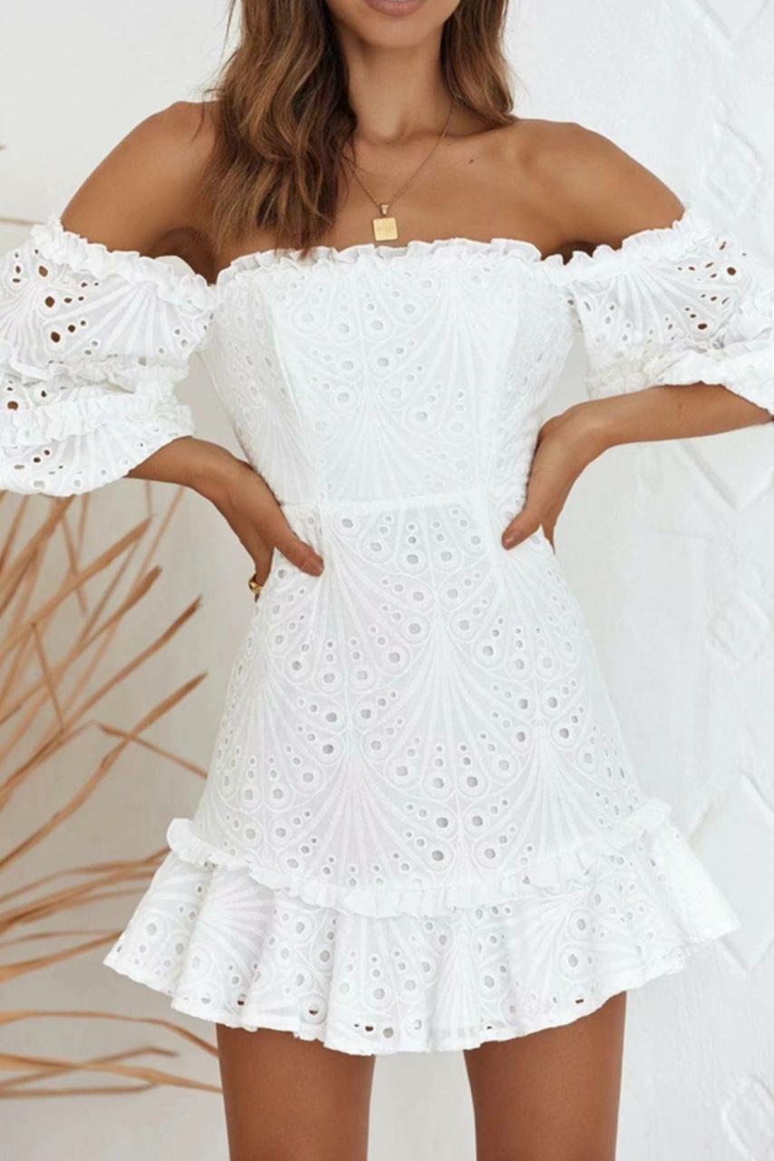 Boho romantic mini έξωμο φόρεμα με βολάν στα μανίκια και στο τελείωμα σε λευκή απόχρωση.