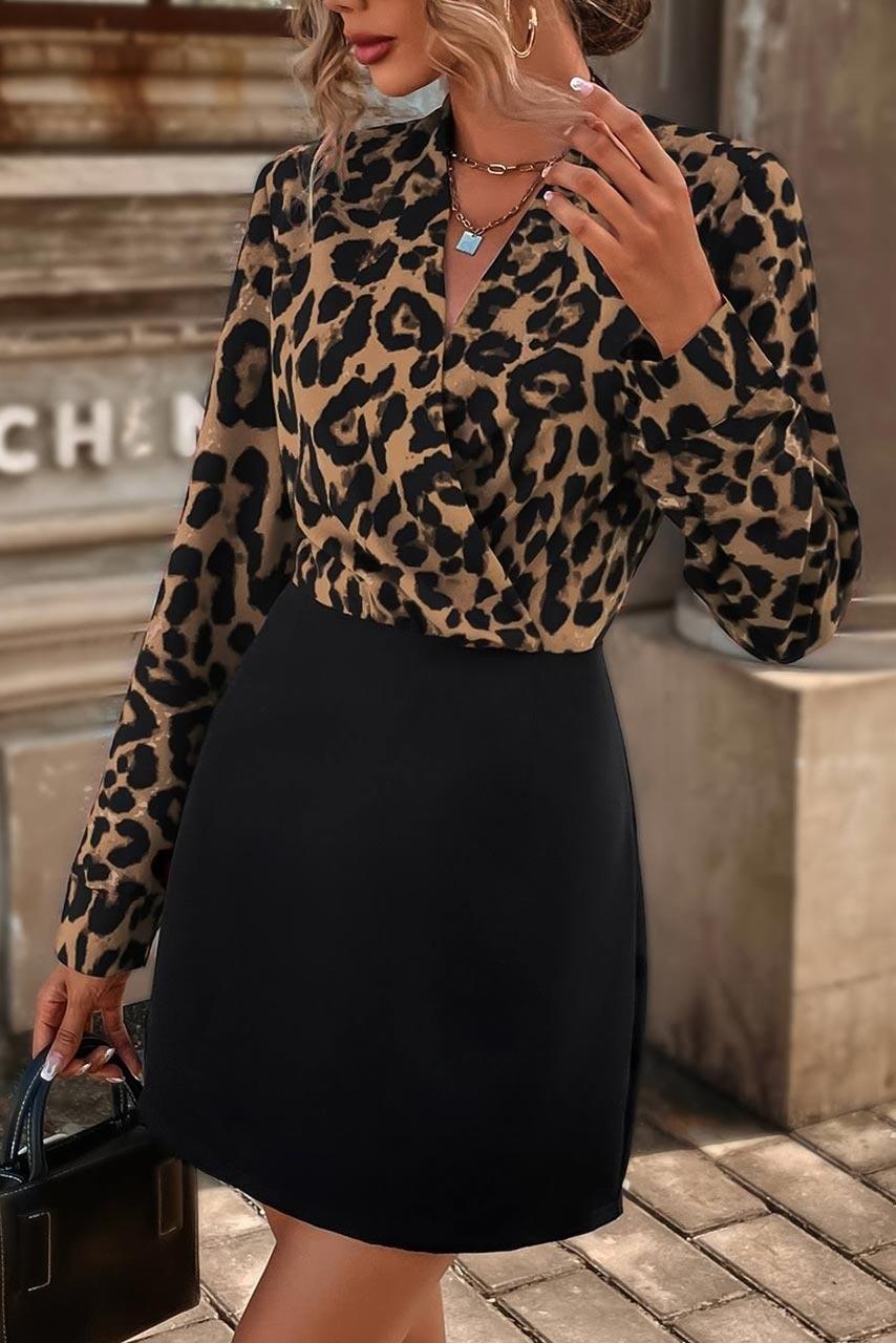 Chic leopard δίχρωμο μίνι φόρεμα με μαύρο κάτω μέρος. Μακρυμάνικο κρουαζέ στο στήθος που αναδεικνύει το μπούστο. Έχει κανονική εφαρμογή και βγαίνει σε νούμερα SM και LXL.