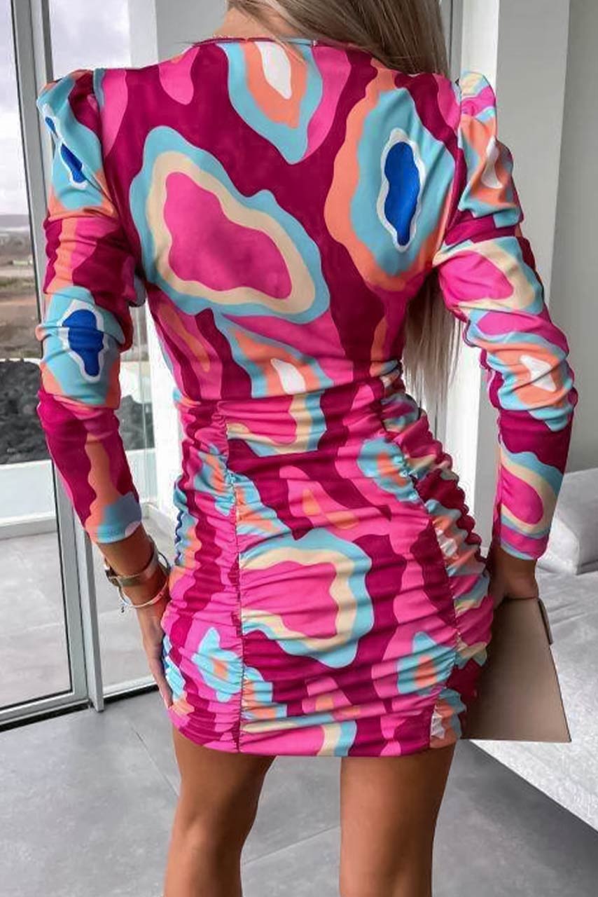 Εφαρμοστό μακρυμάνικο πολύχρωμο office style, μίνι φόρεμα με V neck κρουαζέ κόψιμο στο ντεκολτέ και σούρες, σε funky αποχρώσεις του ροζ.