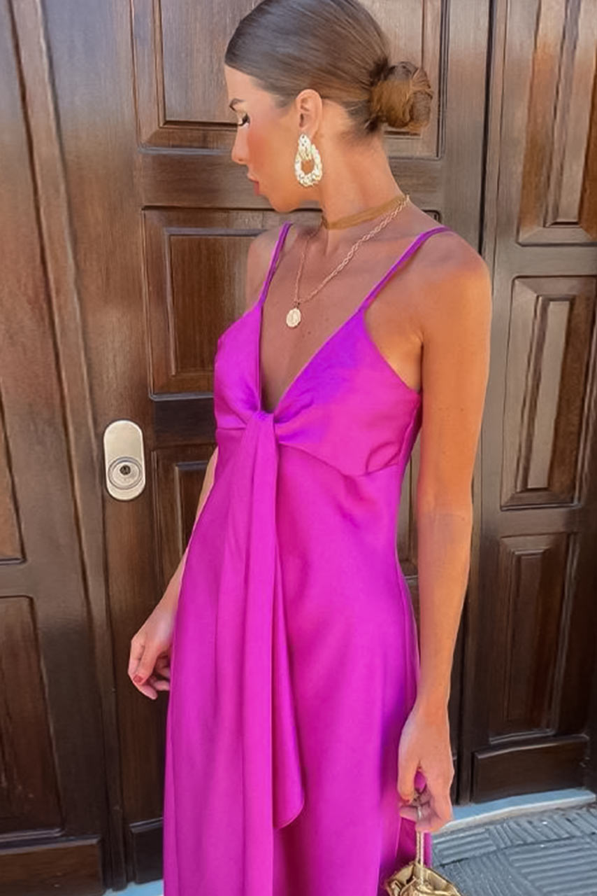 Glam maxi φόρεμα με έντονο ντεκολτέ, χαμηλή πλάτη με αισθησιακό criss cross χιαστί και διακριτικό σκίσιμο μπροστά που το κάνει να ξεχωρίζει από τα basic φορέματα.