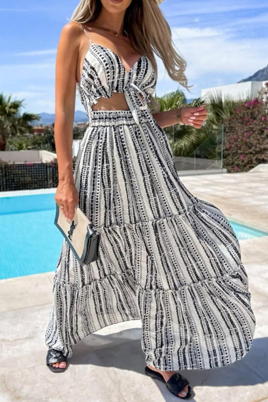 Ethnic chic ριγέ φόρεμα μάξι με cut outs σε ασπρόμαυρη απόχρωση με λεπτές τιράντες και σειρές βολάν στη φούστα.