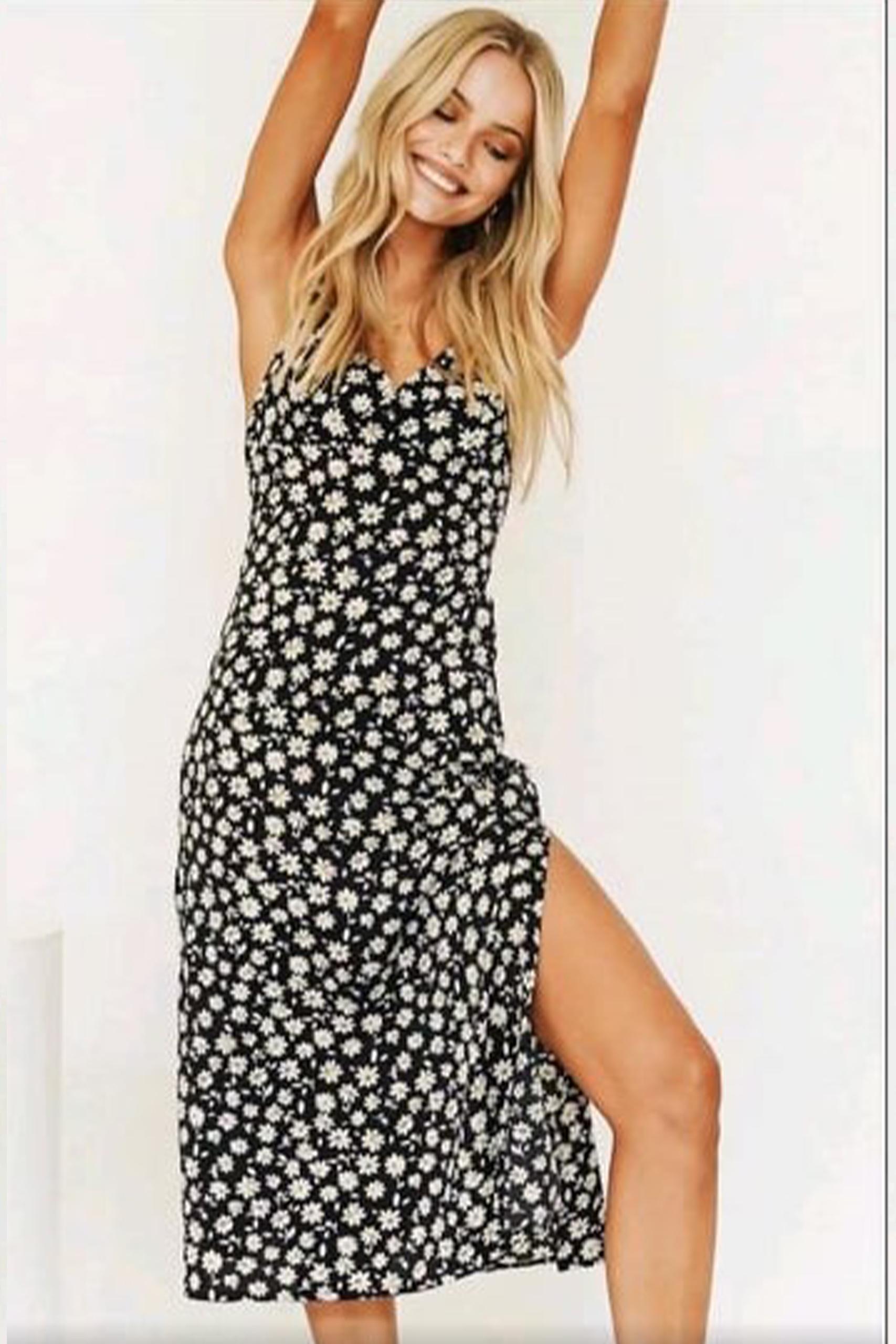 Midi vintage φόρεμα με pattern μαργαρίτες σε μαύρο χρώμα με πολύ λεπτές τιράντες.