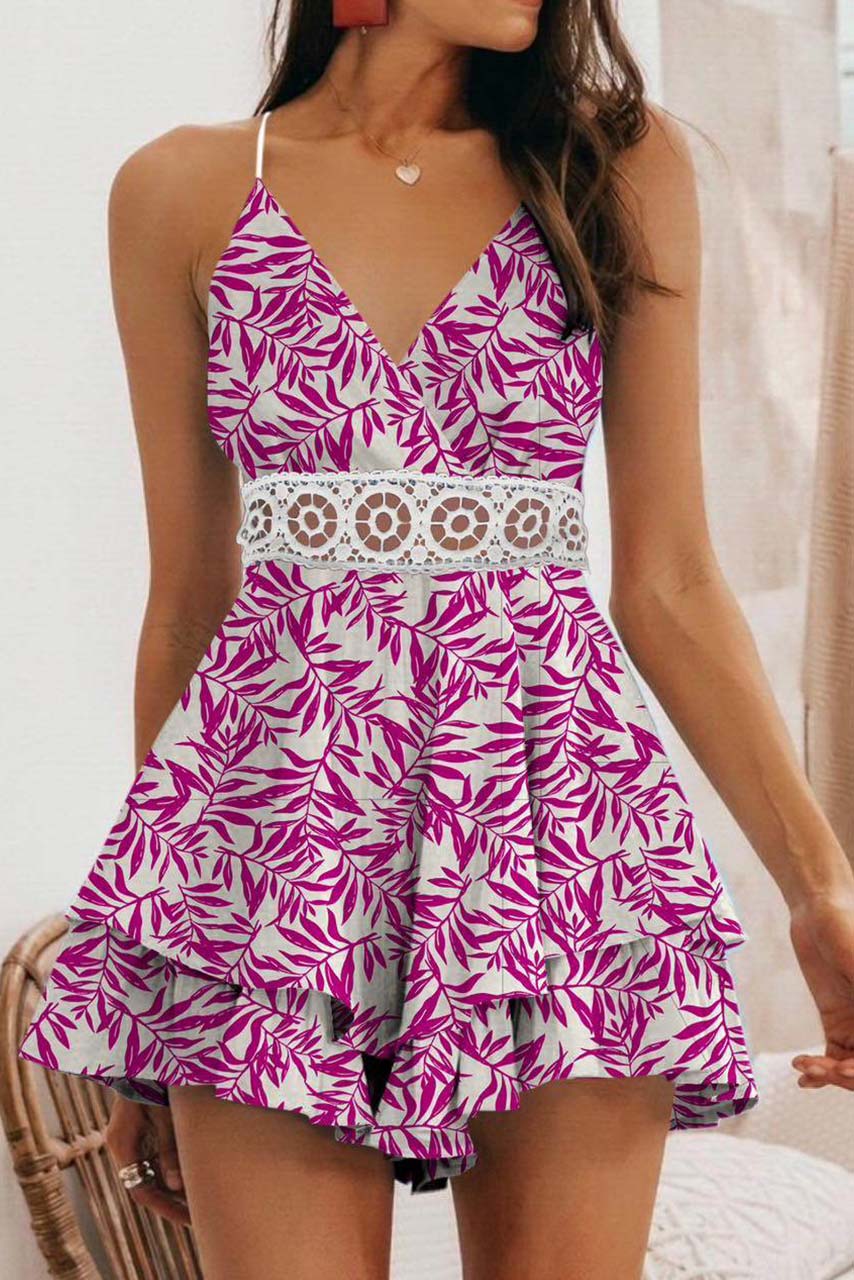 Ολόσωμη φόρμα που θυμίζει φόρεμα με leaf print και λεπτομέρειες από δαντέλα στην μέση. Διαθέτει ελαστικές ρυθμιζόμενες τιράντες.