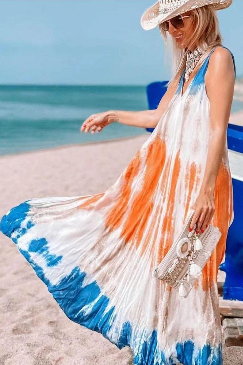 90s inspired tie dye μάξι φόρεμα σε λευκή, μπλε και πορτοκαλί απόχρωση με φαρδιές τιράντες και μεγάλο V neck.