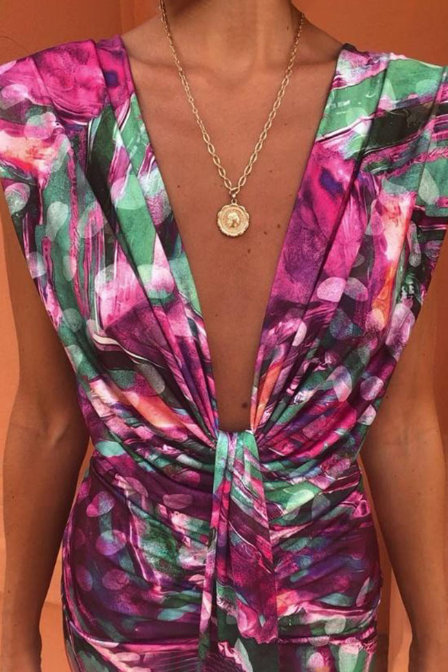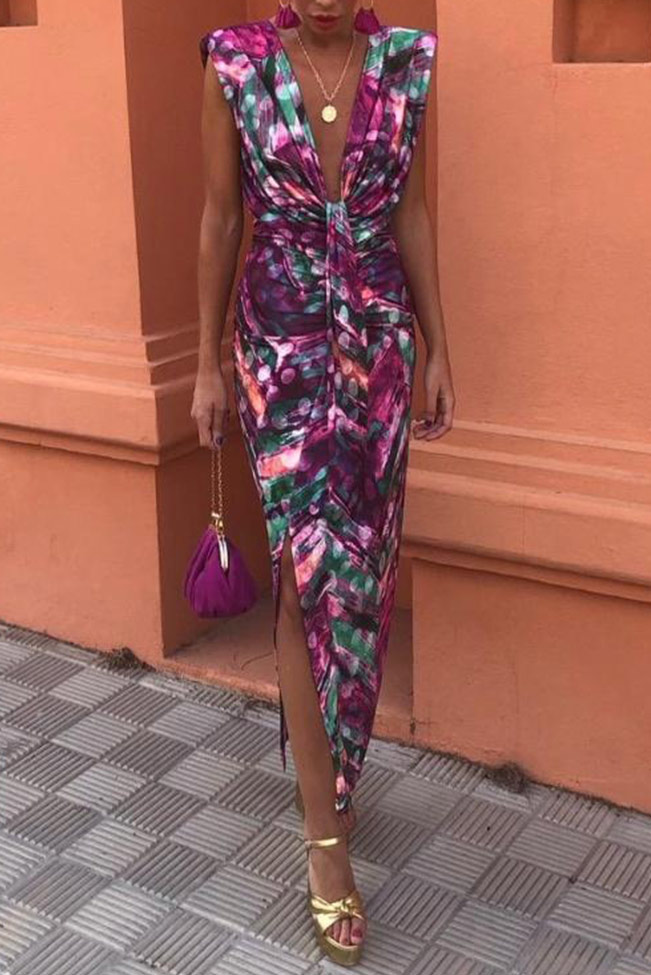 Μακρύ πολύχρωμο ultra romantic φόρεμα με βάτες και βαθύ ντεκολτέ με δέσιμο. Διαθέτει σκίσιμο στο πλάι και είναι ιδανικό για τις special εμφανίσεις του καλοκαιριού.