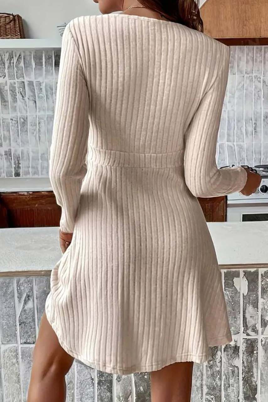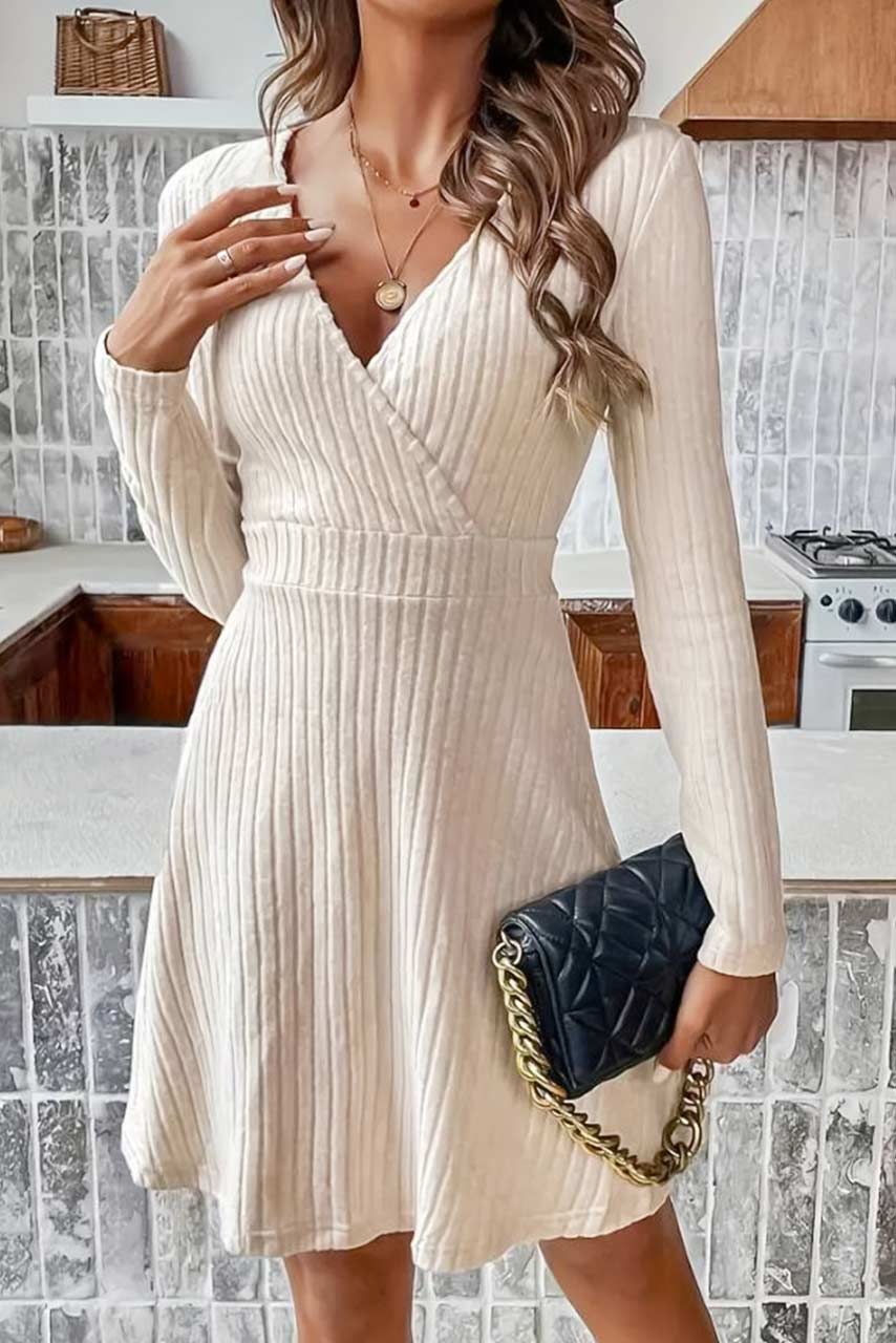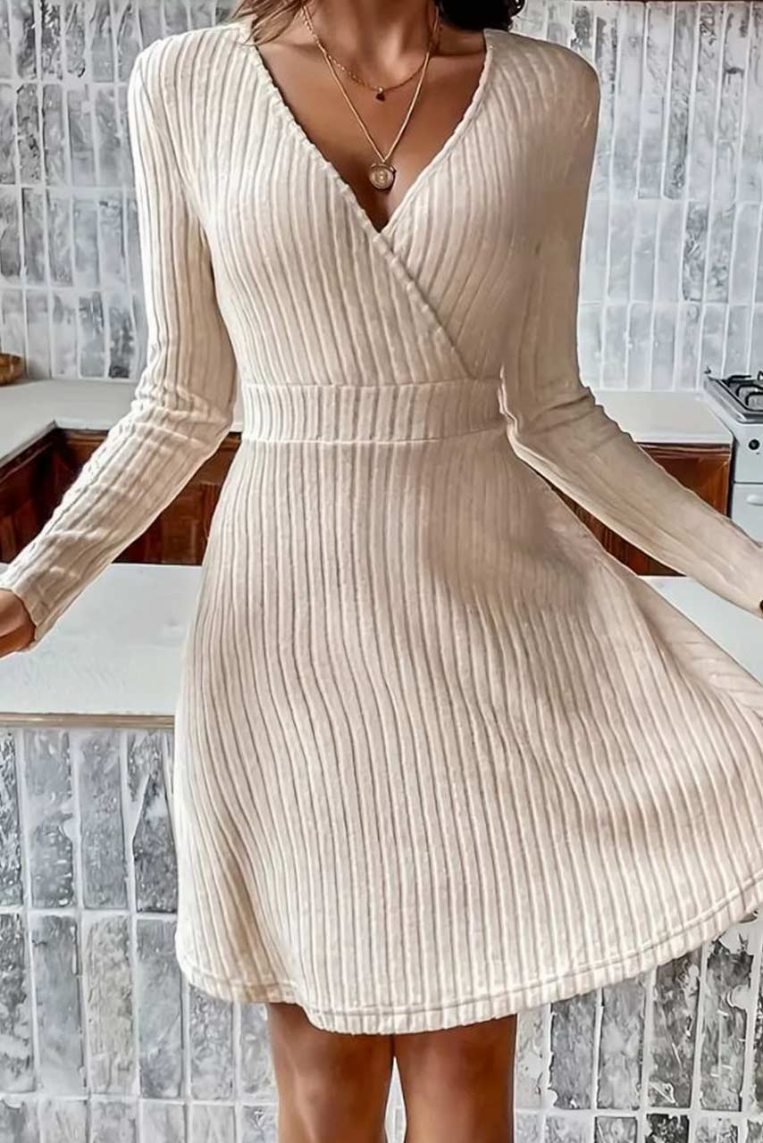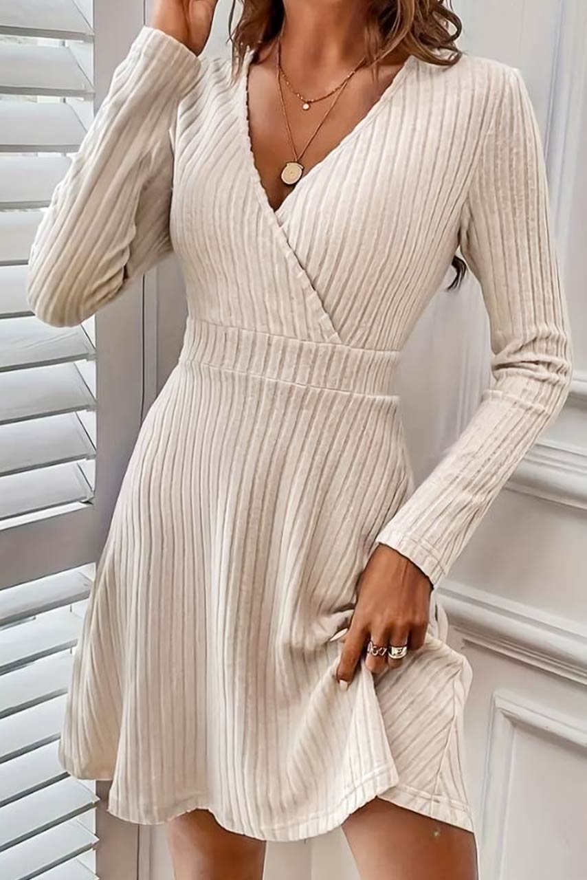 Κομψό rib μπεζ φόρεμα με V-λαιμόκοψη με μακριά μανίκια και λάστιχο στην μέση, που τονίζει τη σιλουέτα. Ιδανικό για να το φοράς απο πρωί ώς το βράδυ.