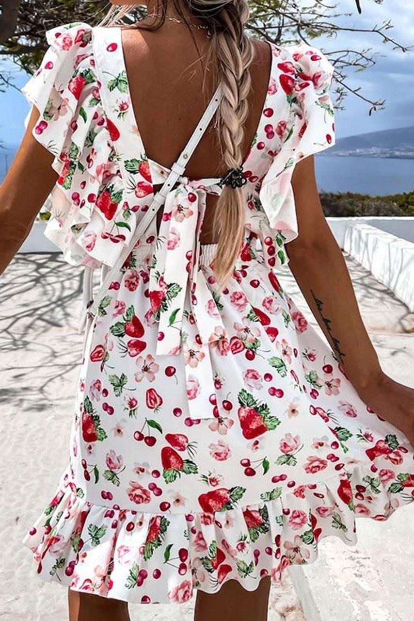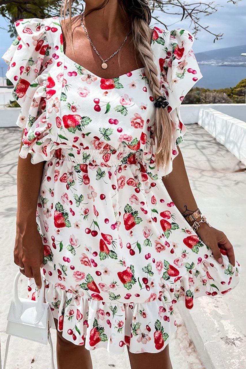 Romantic retro floral μίνι φόρεμα με βολάν σε ανοιξιάτικο πολύχρωμο μοτίβο με λευκή βάση και φραμπαλά στο τελείωμα και στα μανίκια.