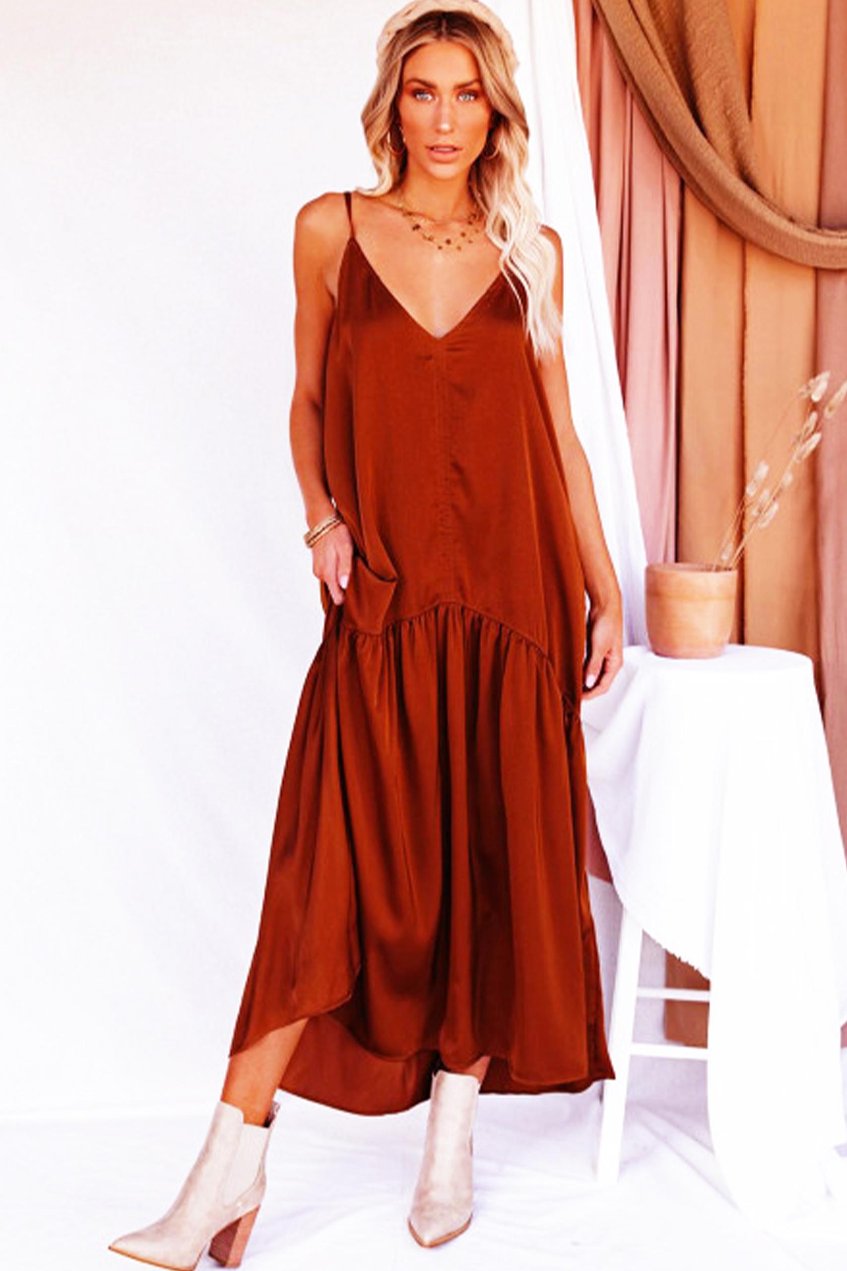 Flounce boho φόρεμα σε δύο φθινοπωρινές αποχρώσεις με τελείωμα σε Α γραμμή και πολύ λεπτές τιράντες.