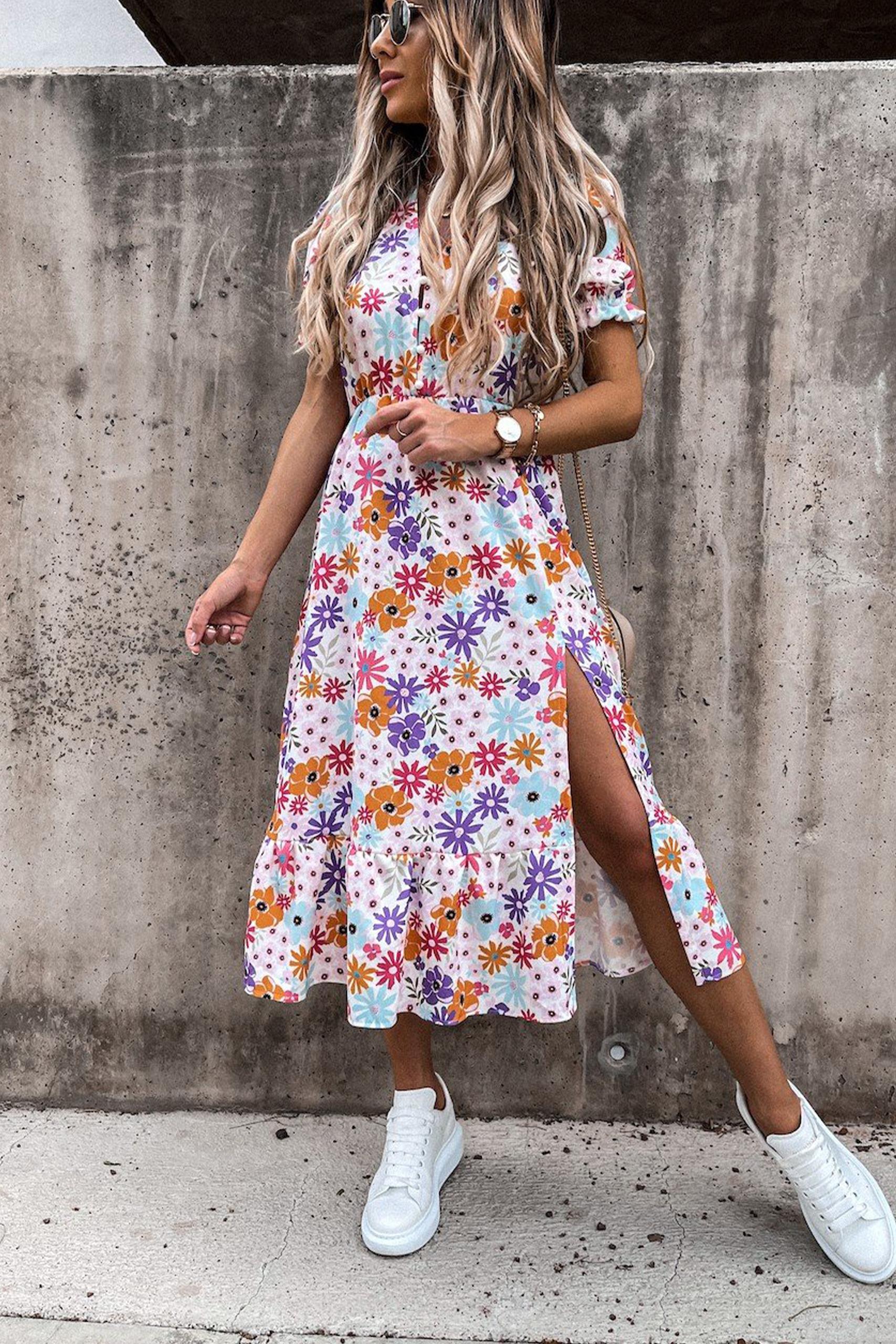 Λευκό floral midi φόρεμα με πολύχρωμα λουλούδια και vintage λευκά κουμπιά.