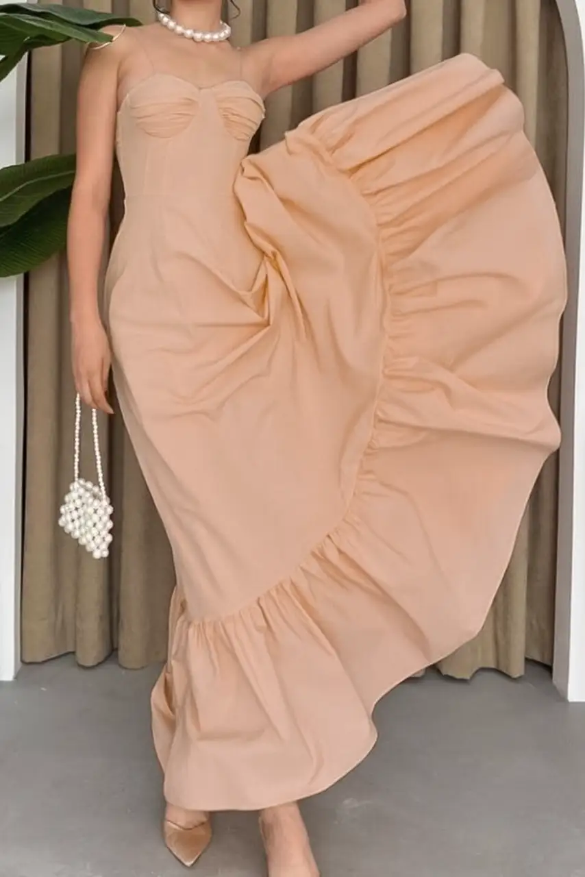 Εντυπωσιακή απλότητα που ξεχωρίζει! Το μπεζ μάξι φόρεμα με κορσέ μπούστο και ρυθμιζόμενες τιράντες που δένουν, αποπνέει ρομαντική φινέτσα με έναν boho chic αέρα. Η γραμμή του αγκαλιάζει το σώμα κολακευτικά, ενώ η φαρδιά βολάν φούστα χαρίζει αέρινη κίνηση. Είτε το φορέσετε ξυπόλητες σε ένα νησιώτικο σοκάκι είτε με πέδιλα για μια city-chic έξοδο, το look σας θα μαγνητίσει τα βλέμματα.