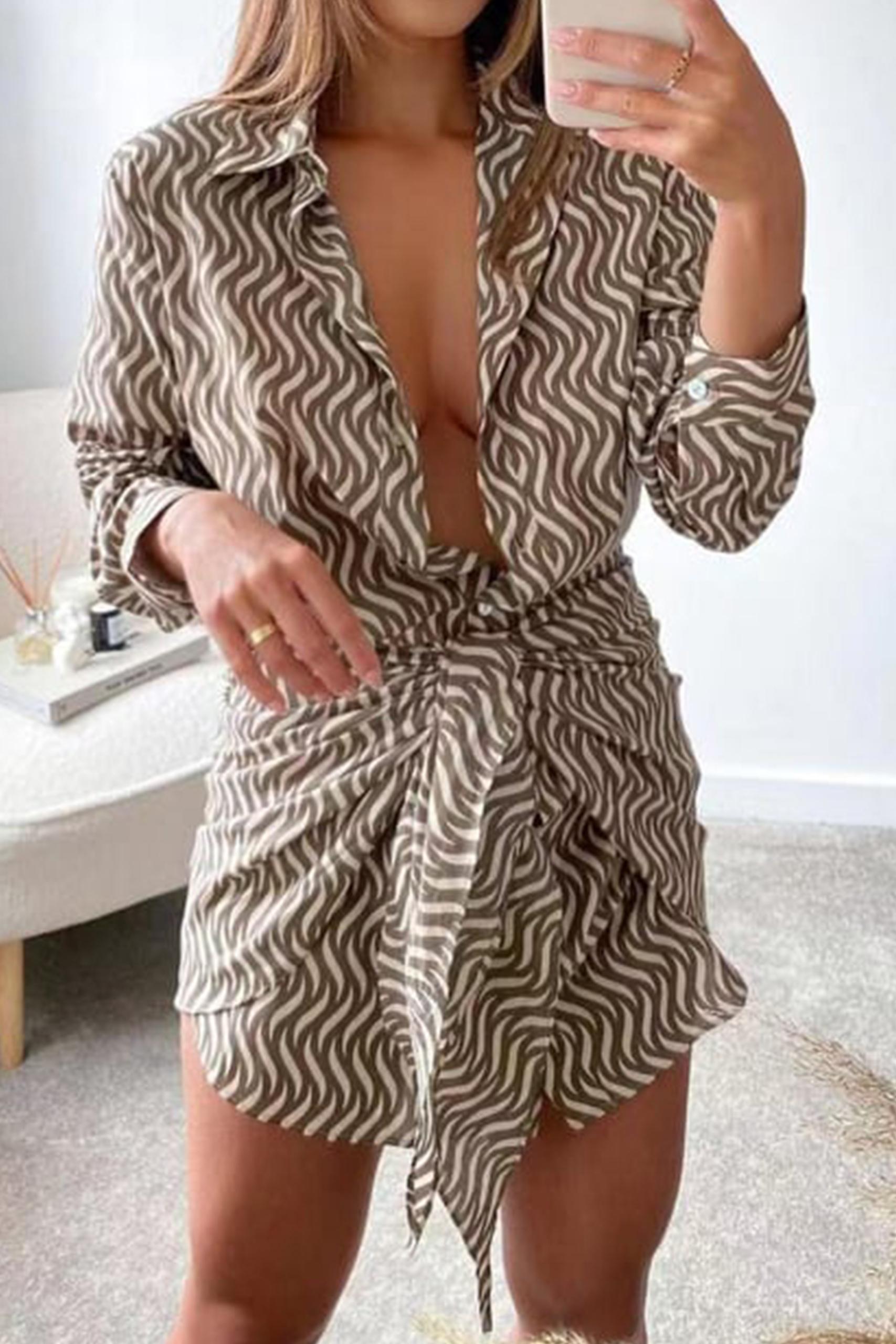 Front tie εμπριμέ φόρεμα σε μπεζ αποχρώσεις με λεπτομέρεια δέσιμο στο πλάι.