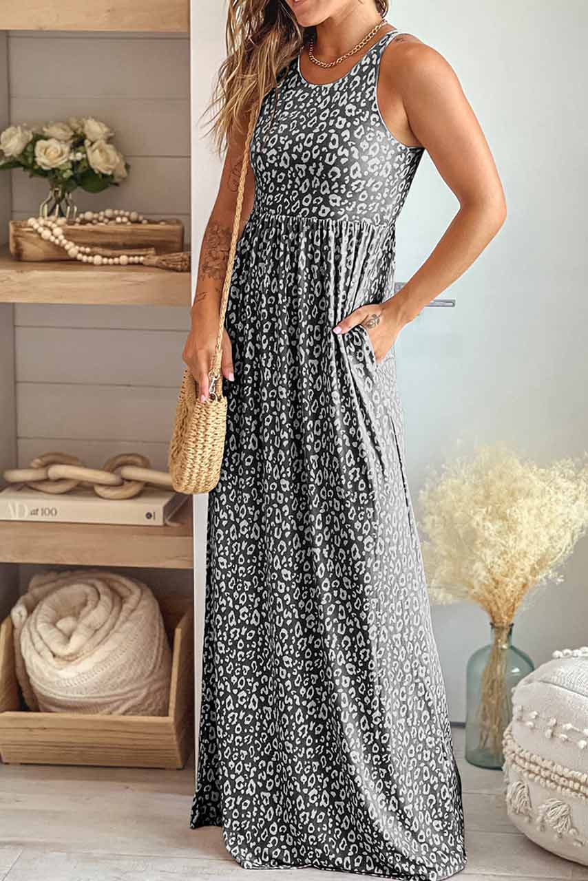 Λέοπαρ maxi φόρεμα σε ουδέτερη trendy γκρι απόχρωση με τσέπες στα πλάγια. Casual, εντυπωσιακό και άνετο για τις ζεστές καλοκαιρινές μέρες.