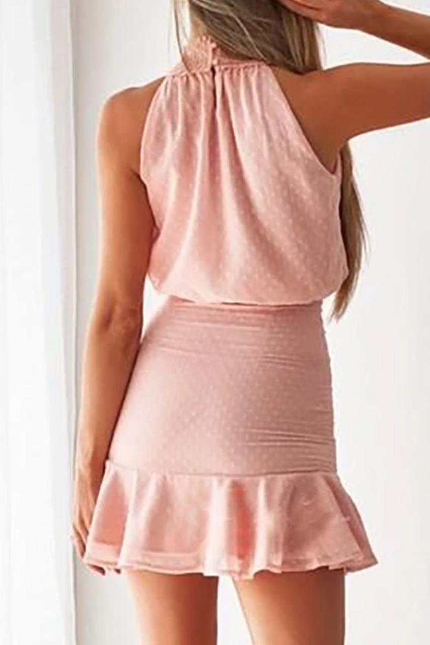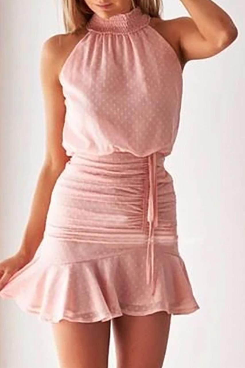 Polkadot romantic retro halter neck μίνι φόρεμα σε παλ ροζ απόχρωση με πουά μοτίβα και ρομαντική γραμμή με δέσιμο στο λαιμό.