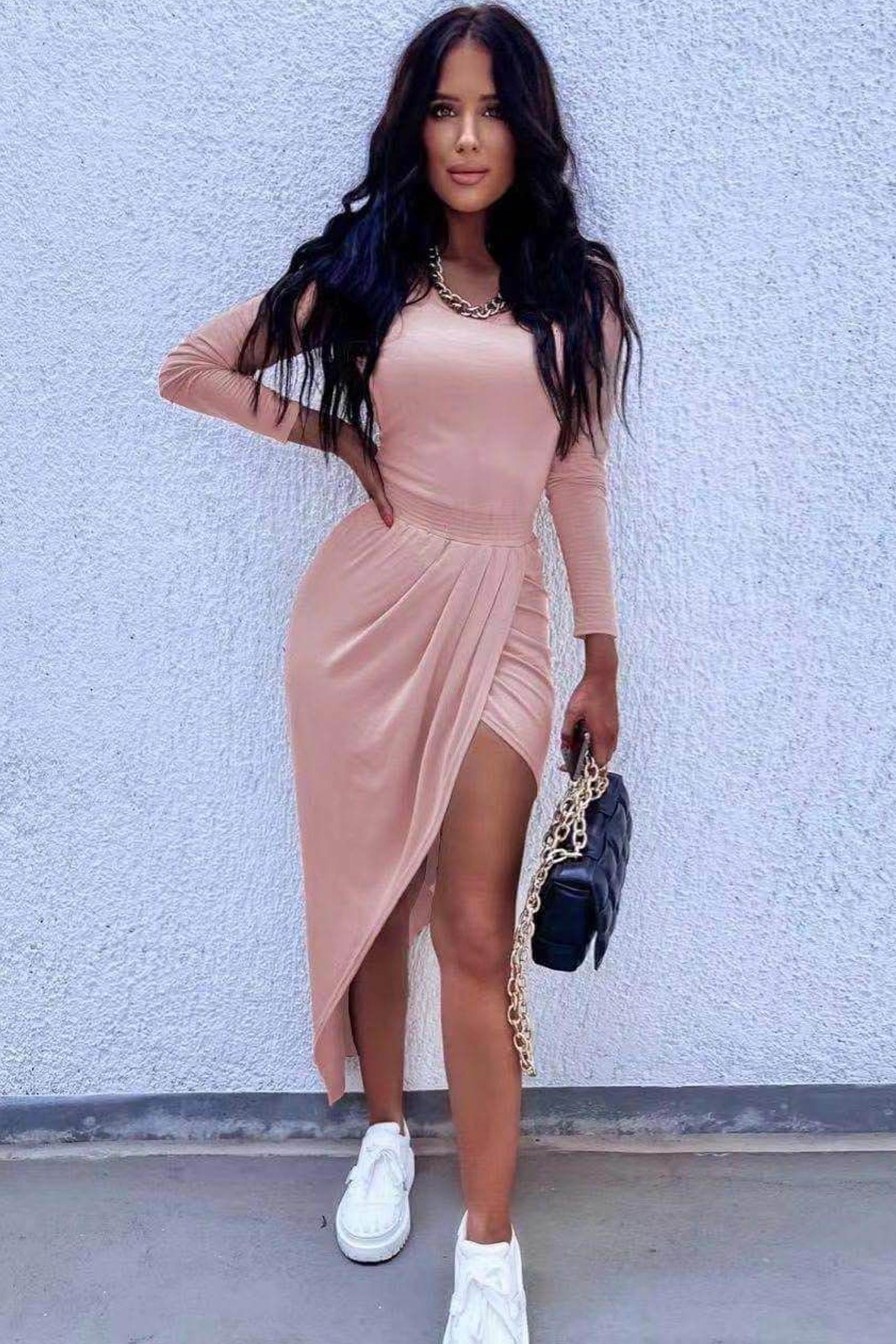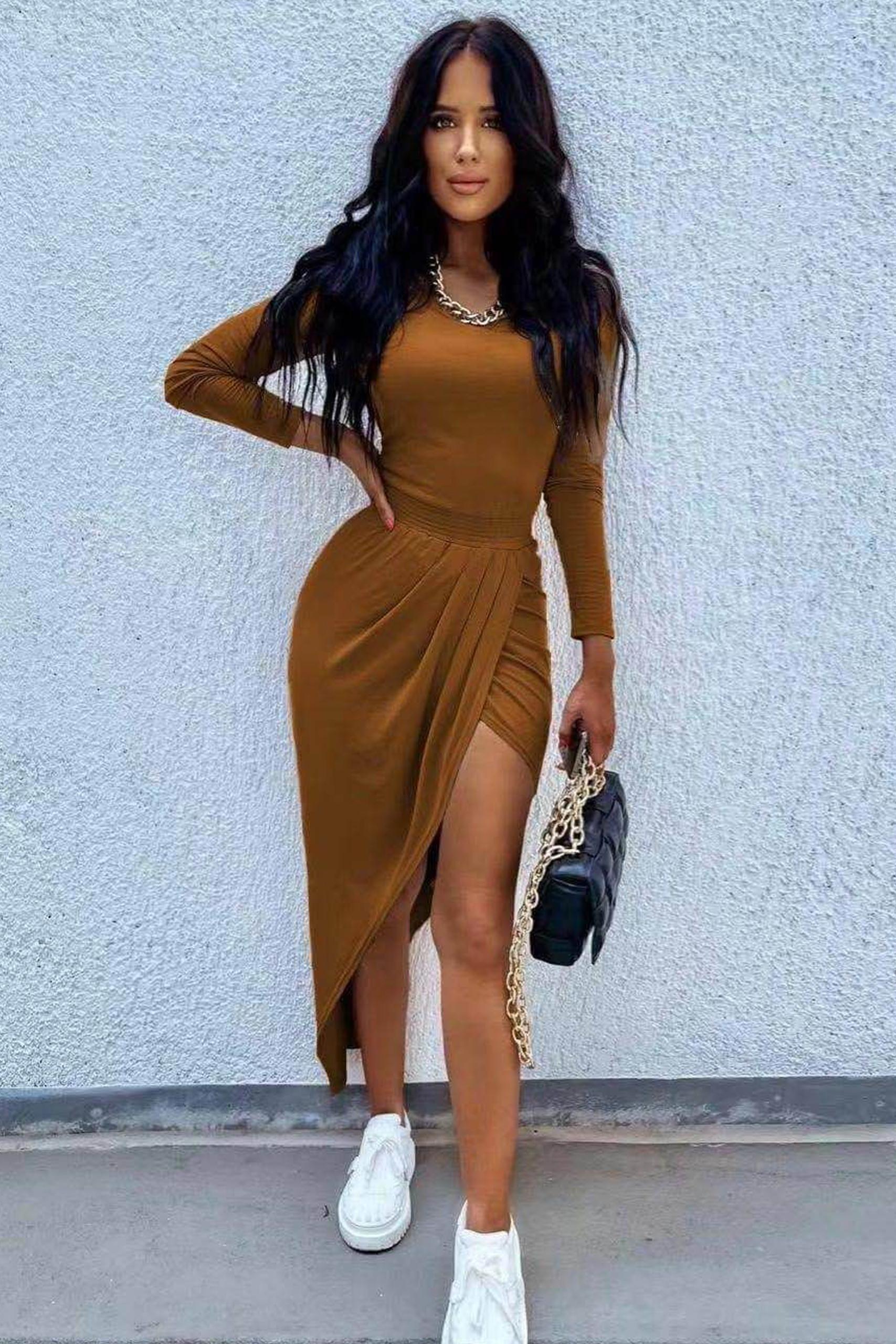High slit ασύμμετρο φόρεμα σε γήινες αποχρώσεις με λάστιχο στη μέση.