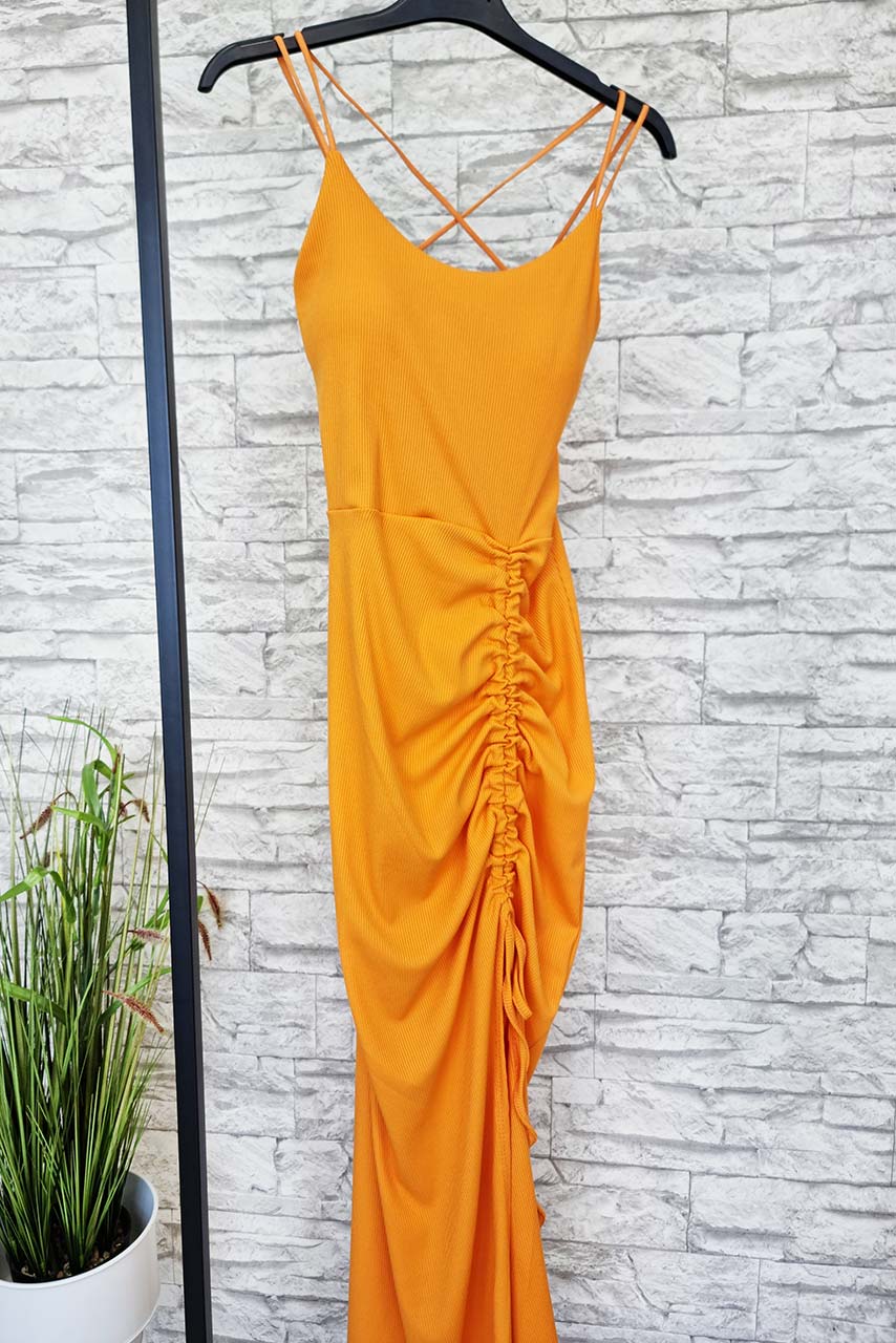Casual chic midi high slit φόρεμα με τιράντες, χιαστί πλάτη και ψηλό άνοιγμα στο πλάι που ρυθμίζεται με το κορδόνι αυξομείωσης, σε κλασσική απόχρωση.