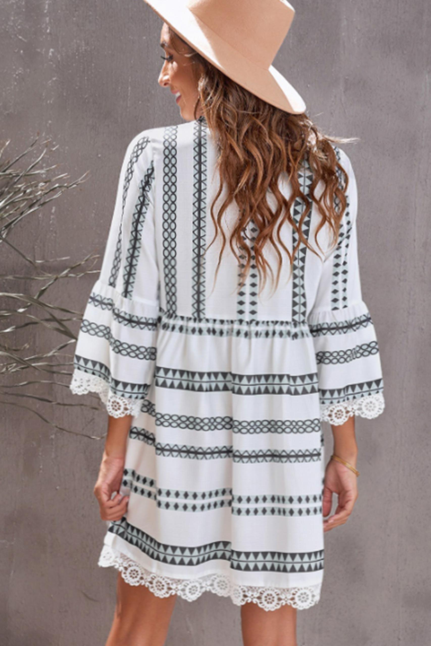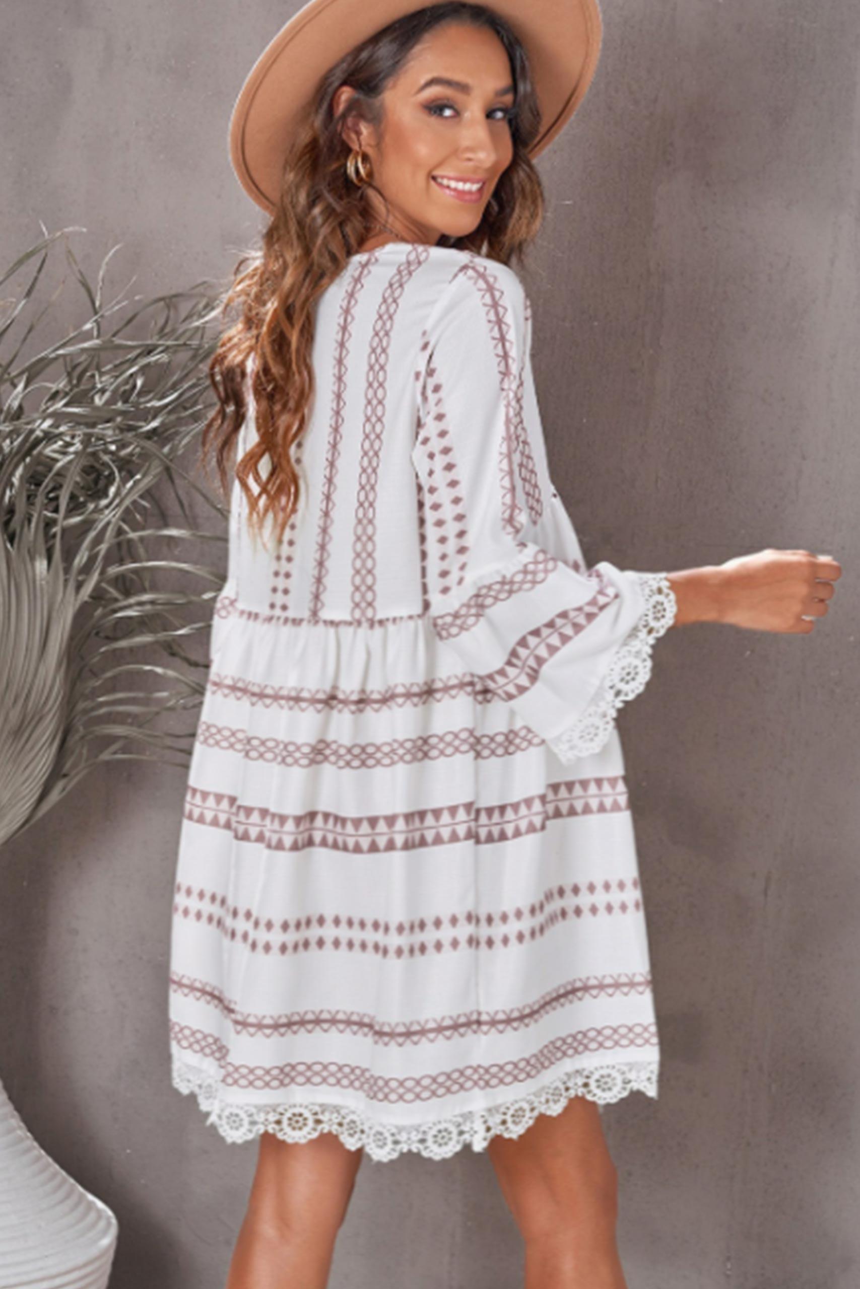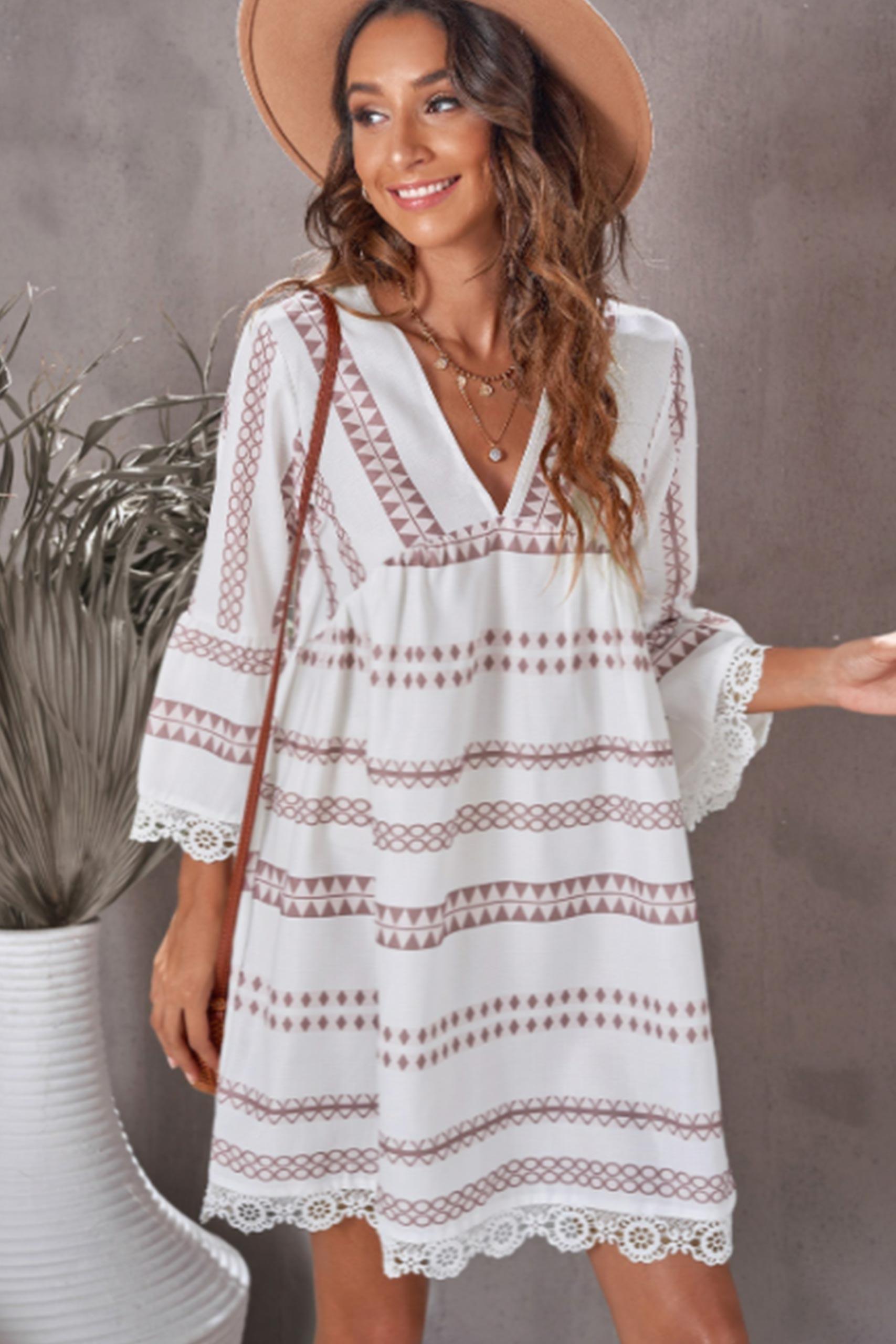 Ethnic chic φόρεμα σε Α γραμμή με V neck με δαντέλα βολάν στο τελείωμα.