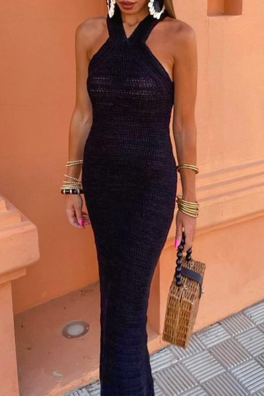 Μακρύ πλεκτό φόρεμα halterneck σε μαύρο