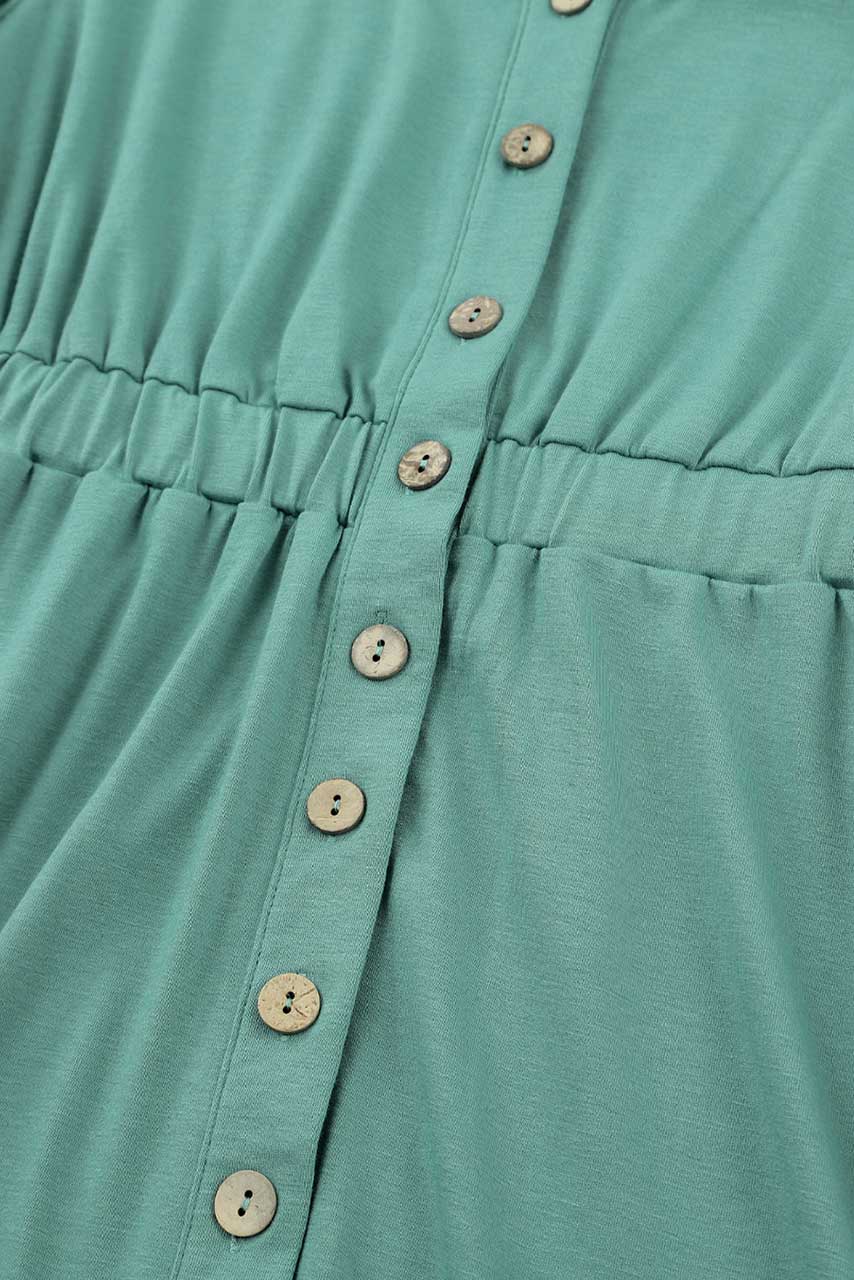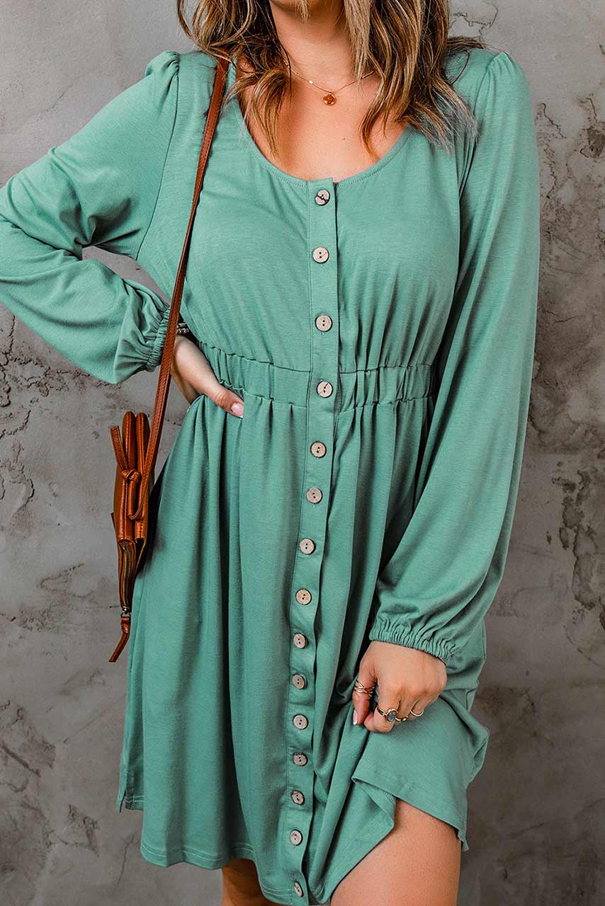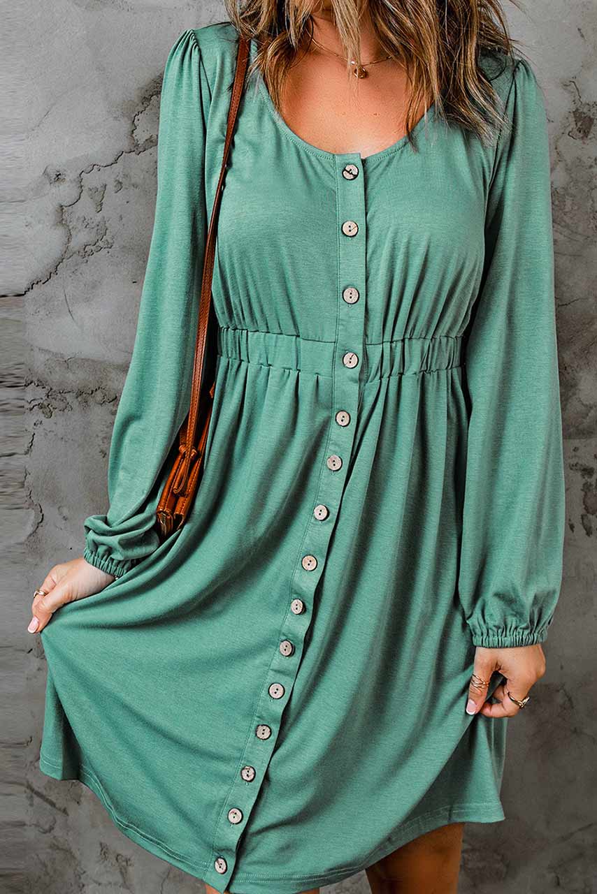 Casual μακρυμάνικο φόρεμα με κουμπιά σε πράσινο. Έχει η ψηλή μέση και η άνετη εφαρμογή. Είναι τέλειο για καθημερινές εμφανίσεις.