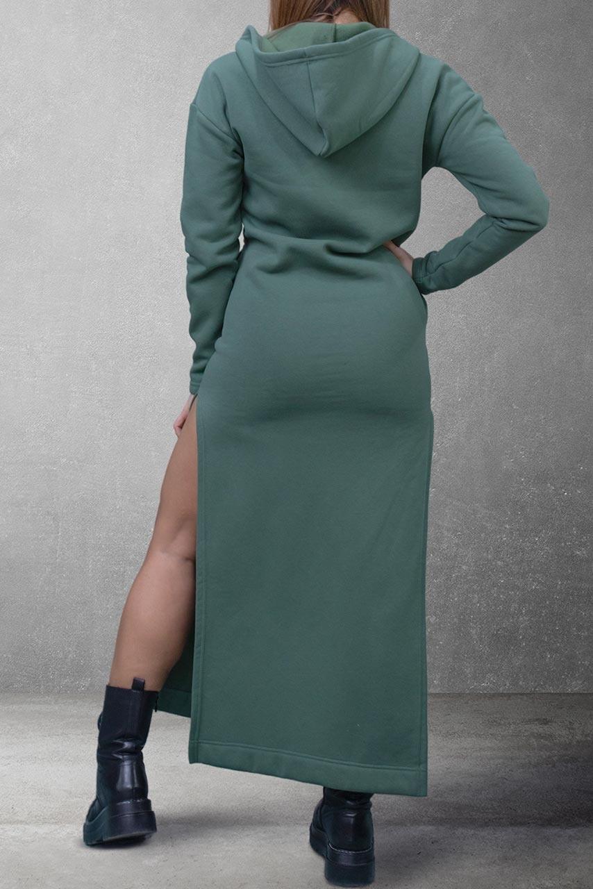 Κομψό maxi φούτερ φόρεμα με πλάγια ανοίγματα και κουκούλα σε χακί απόχρωση. Το ιδανικό βαμβακερό φόρεμα για κάθε χειμωνιάτικη χαλαρή περίσταση.