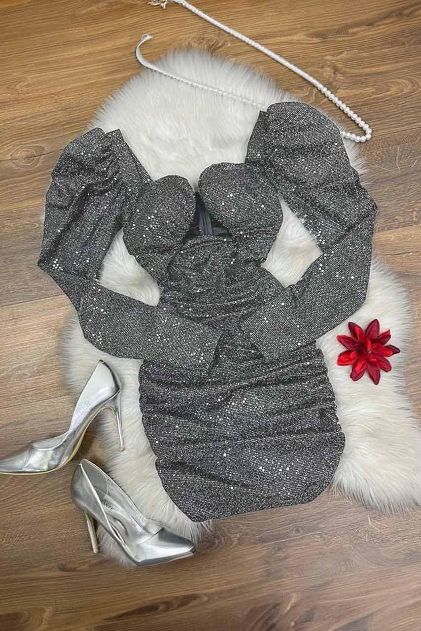 Lurex mini φόρεμα με μανίκια και σούρες. Ένα λαμπερό φόρεμα ιδανικό για τις γιορτινές σου εμφανίσεις.