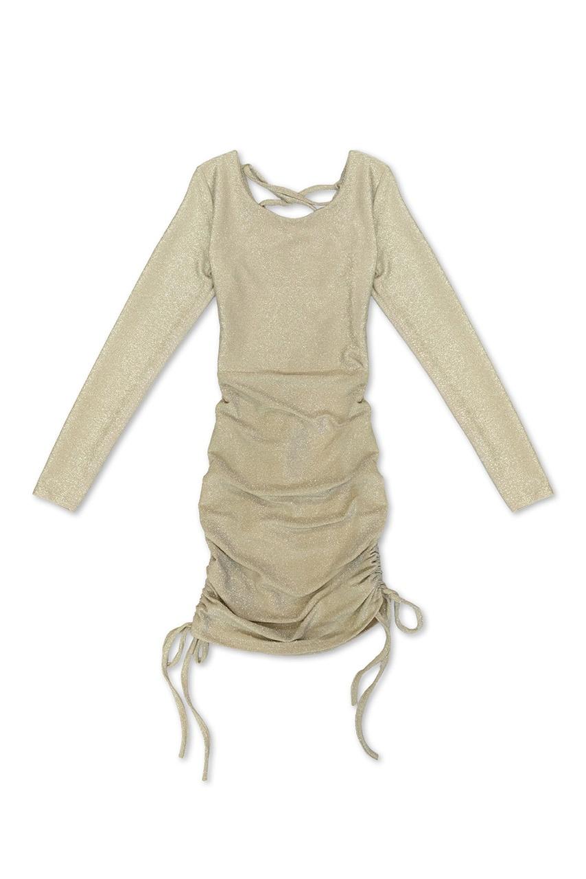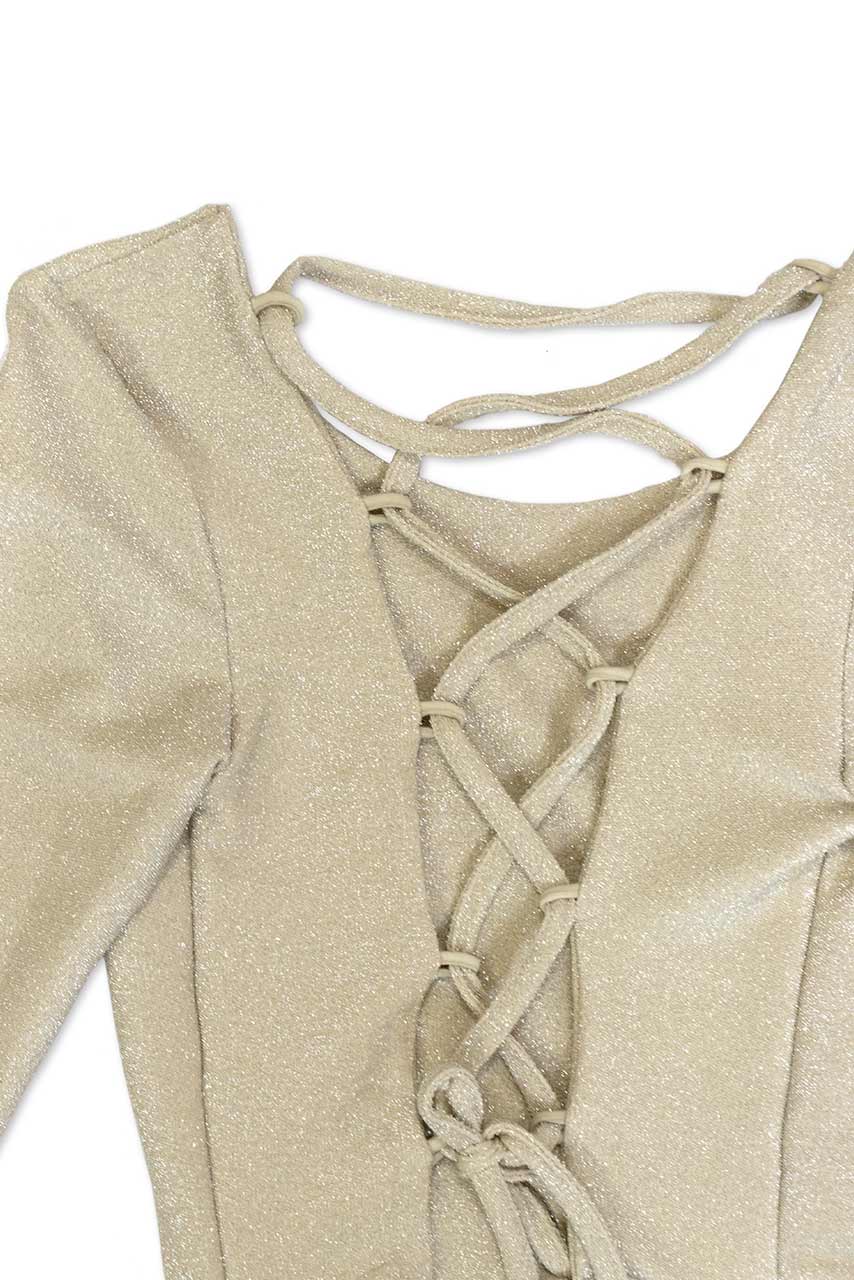 Ένα λαμπερό μίνι lurex φόρεμα με μακριά μανίκια και ρυθμιζόμενα κορδόνια στην πλάτη για λαμπερές εμφανίσεις.