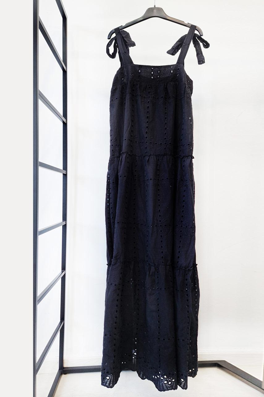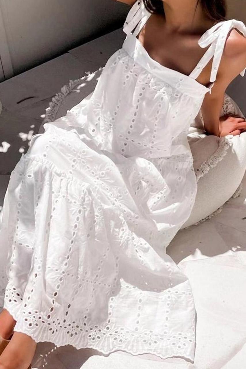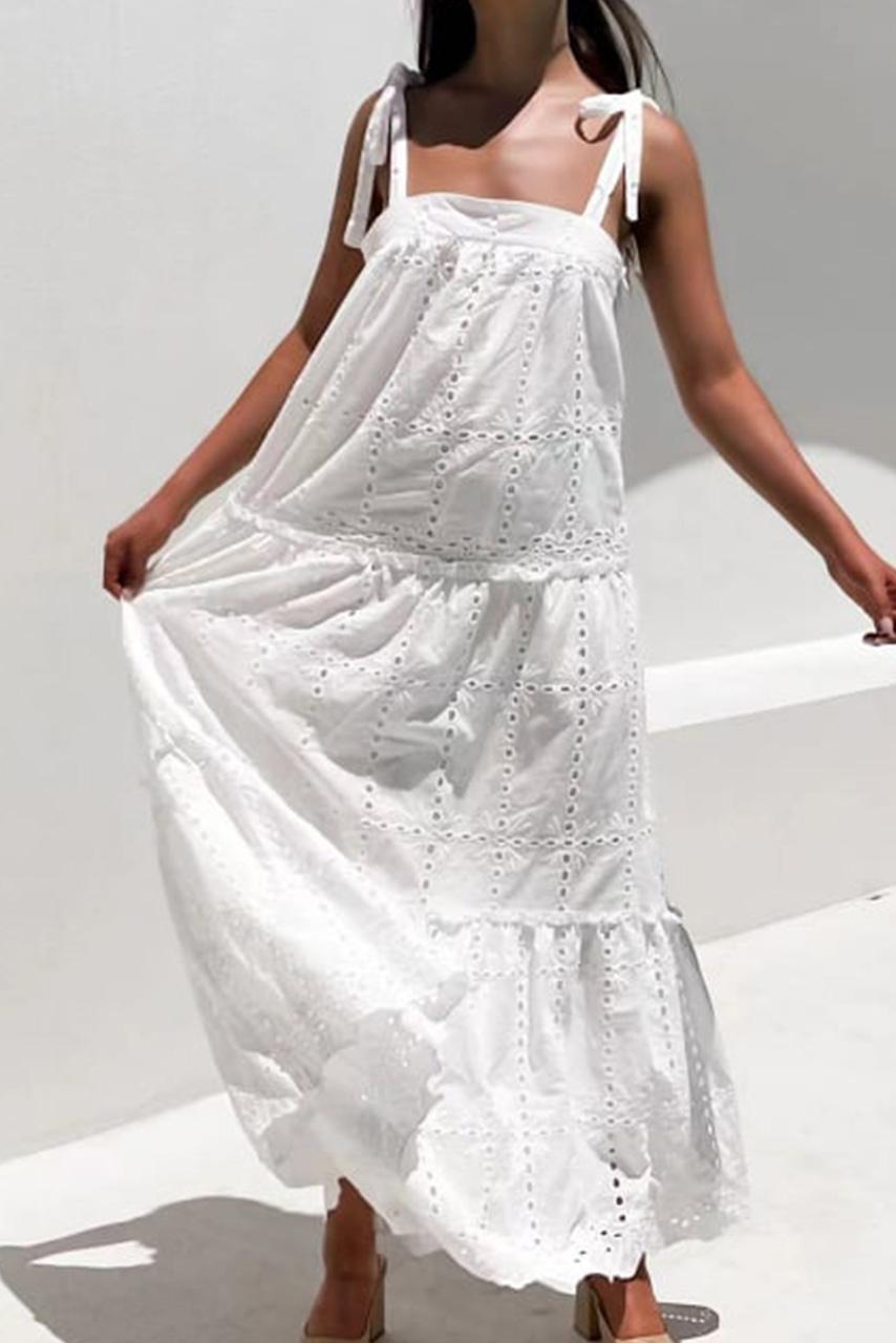 Boho romantic μάξι διάτρητο φόρεμα σε Α γραμμή με τιράντες που δένουν στους ώμους και μικρή σούρα στη μέση.
