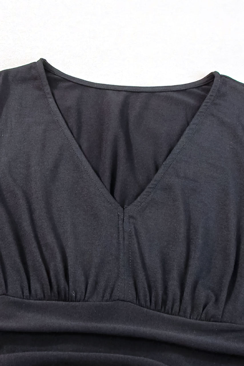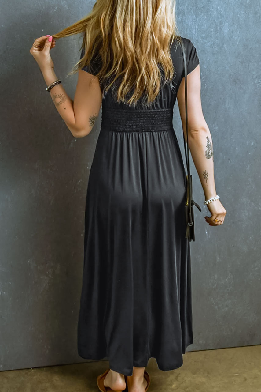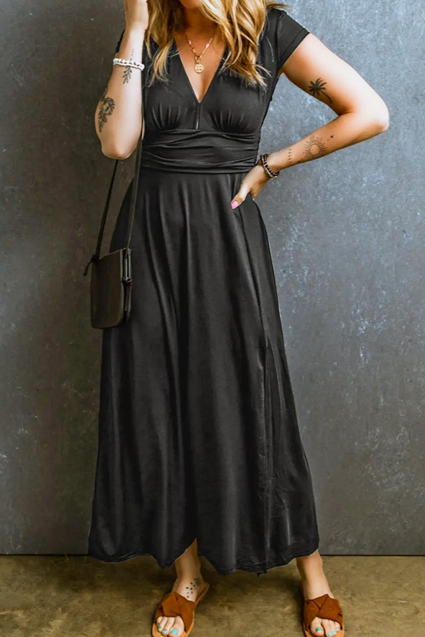 Μαύρο μάξι φόρεμα με κοντά μανίκια και V-ντεκολτέ. Είναι σχεδιασμένο να είναι τόσο κολακευτικό όσο και άνετο,