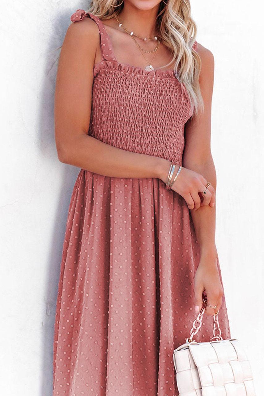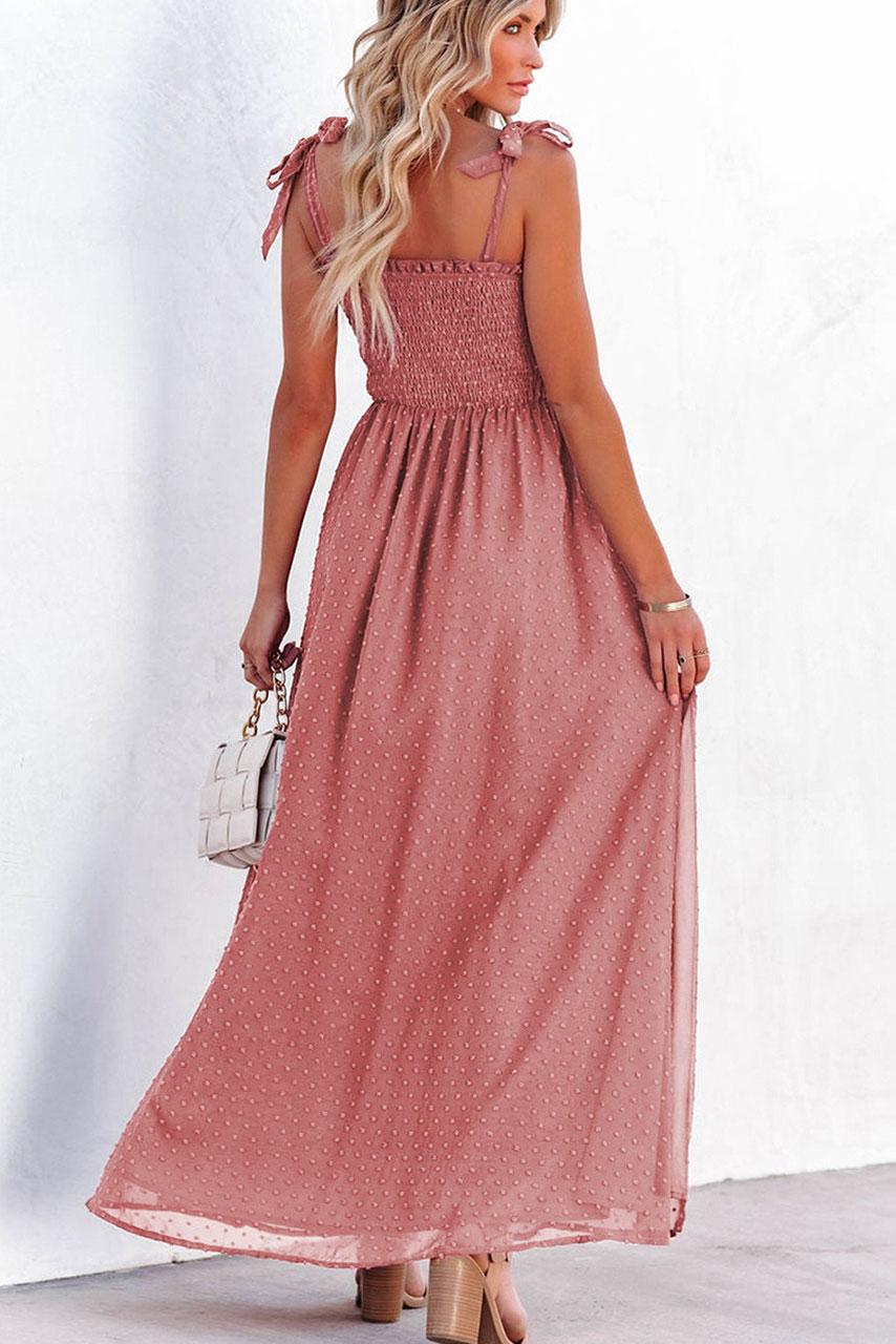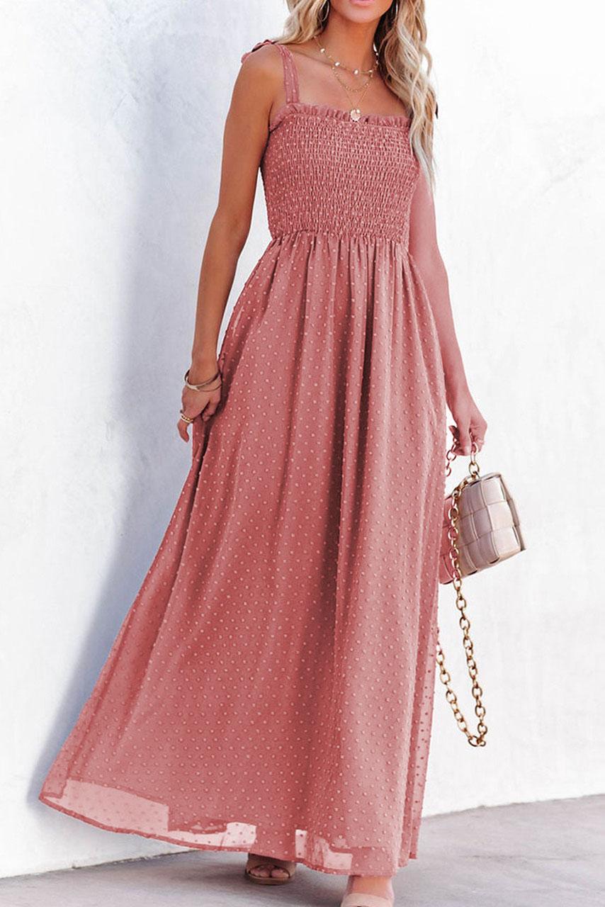 Romantic glam overlay μάξι φόρεμα με σφηκοφωλιά on top στην απόχρωση του dusty pink με πολύ λεπτές τιράντες που δένουν στους ώμους και διάφανο overlay σε πουά ντεσέν.