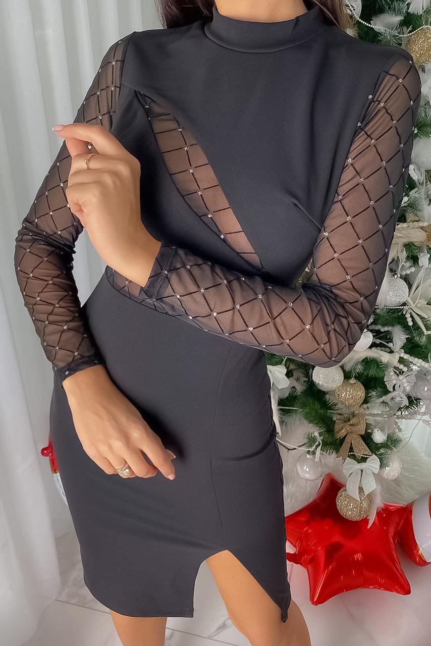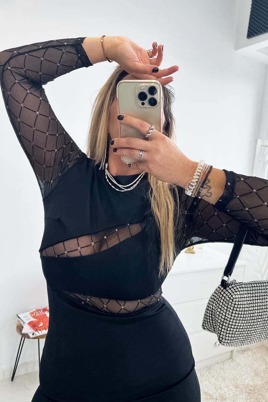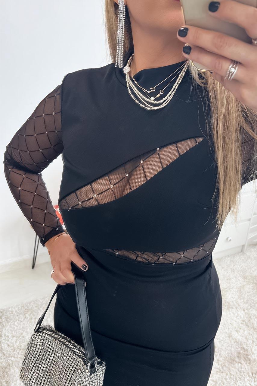 Glam rock mesh details μίνι φόρεμα σε μαύρο χρώμα με λεπτομέρειες διαφάνειας και μικρό ζιβάγκο λαιμόκοψη.